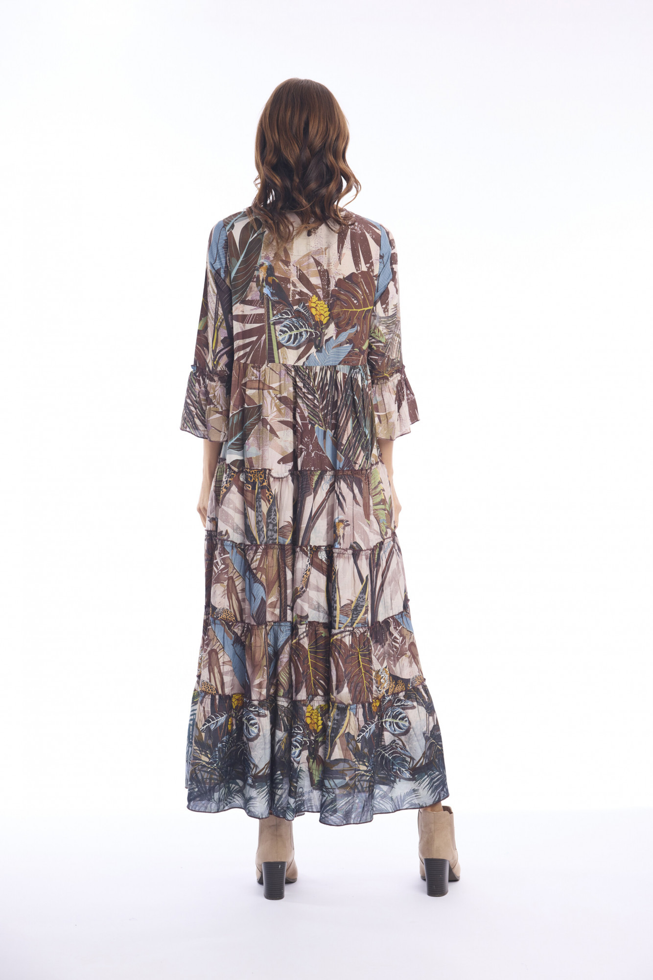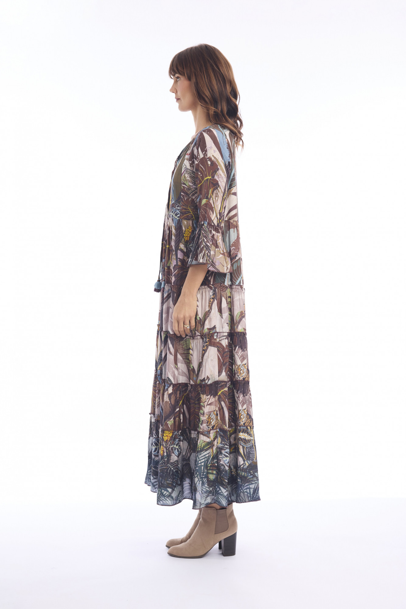 Crafted from 100% rayon, the Almasa Dress embodies bohemian elegance with its flowing, tiered silhouette and rich, tapestry-inspired print. Designed for ease and movement, it combines earthy tones with intricate botanical and architectural motifs, evoking a sense of relaxed, artistic luxury. The three-quarter bell sleeves, tasseled ties, and contrasting hem border add thoughtful details that make it perfect for resort wear or statement everyday style.