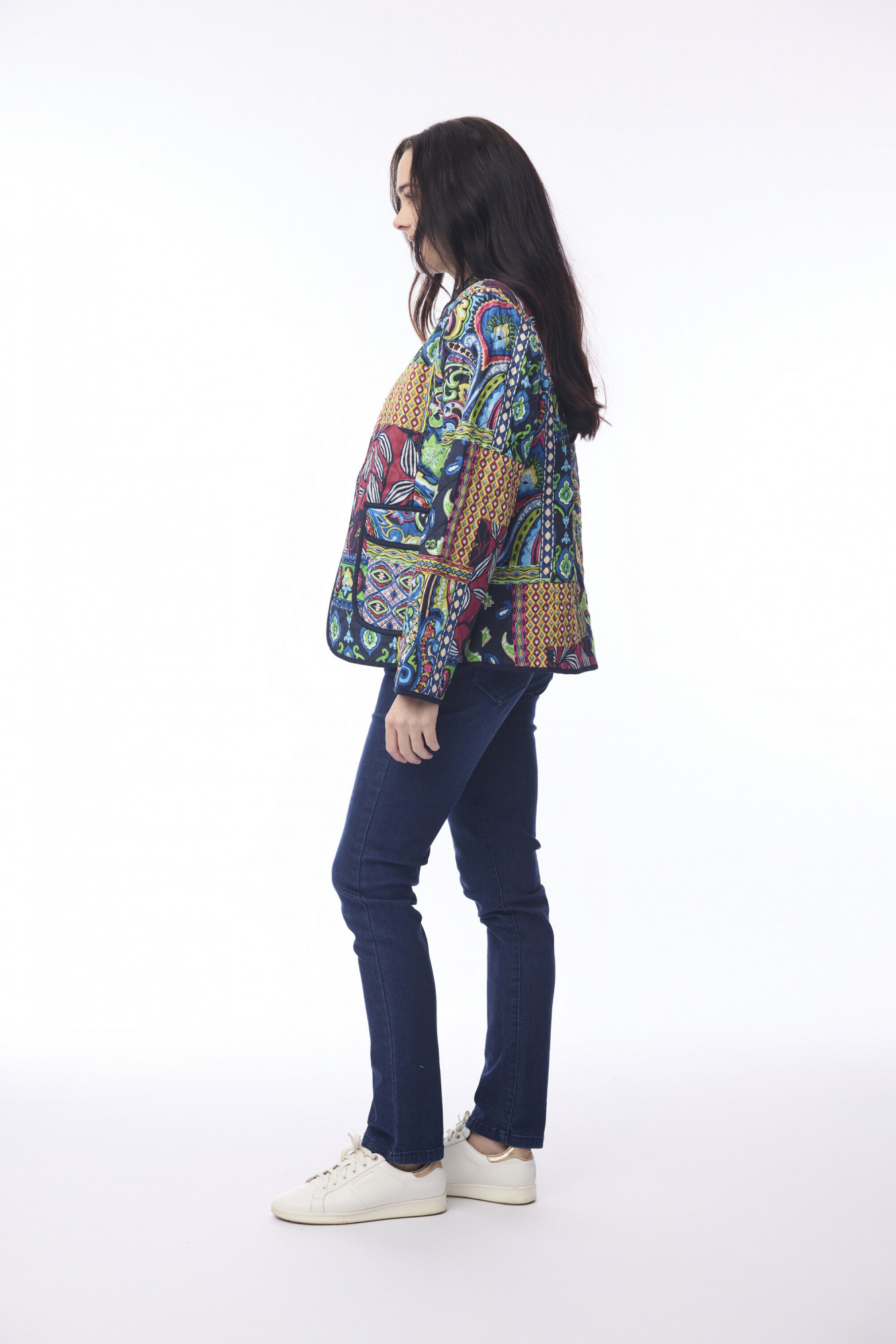 The Aubusson Jacket Quilted is a true statement piece, blending comfort with vibrant artistry. Crafted from 100% rayon, this hip-length jacket features a relaxed, boxy fit and intricate quilting for added texture. A band collar and snap-button front keep the look sleek, while two front patch pockets add practicality. The standout feature is the striking patchwork design—an eclectic mix of paisley, florals, geometrics, and swirls in a vivid palette of blues, greens, reds, pinks, and gold accents. Perfect for layering, this bohemian-inspired jacket brings color and character to every outfit.