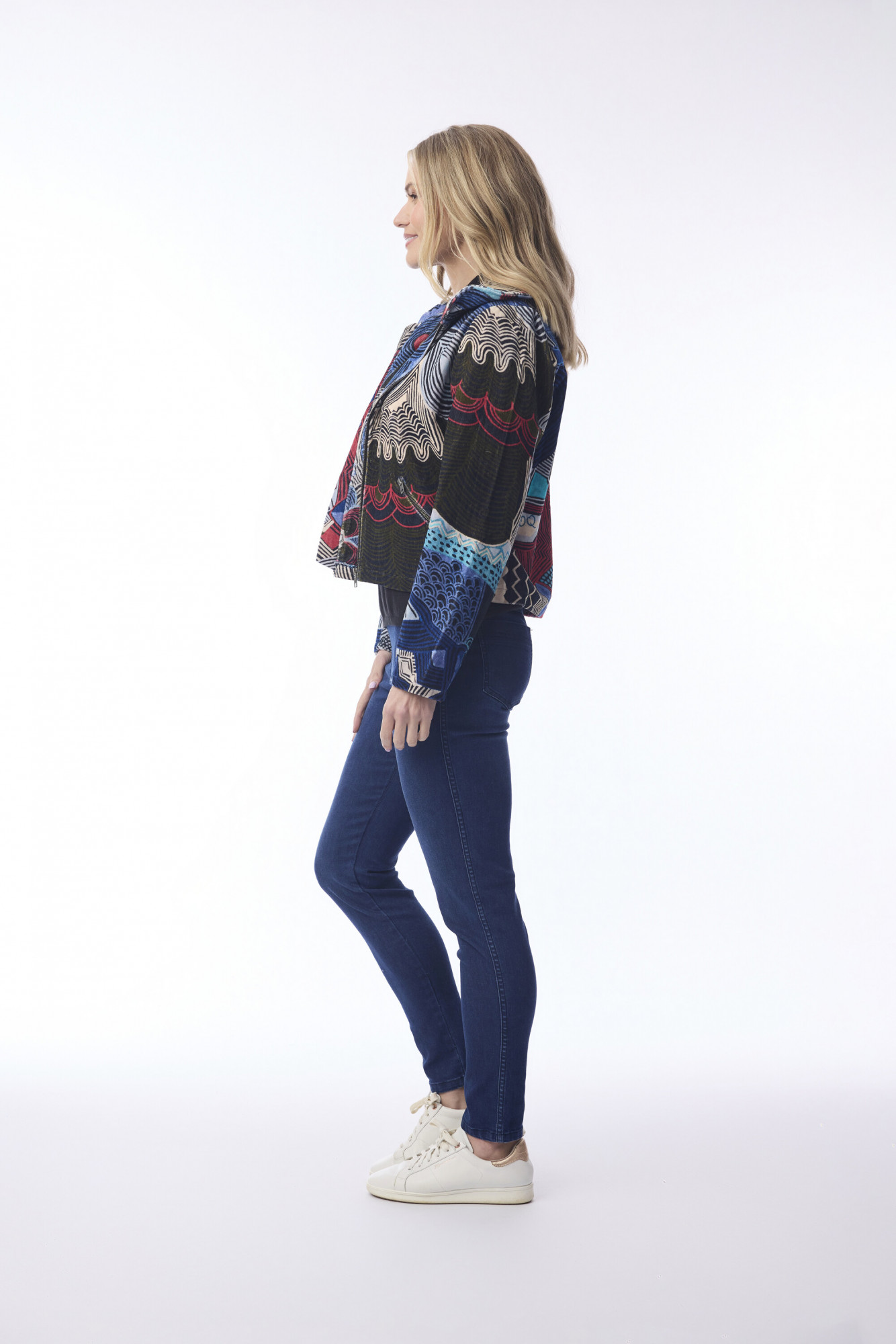 The Benin Jacket is a fabulous way to elevate your winter wardrobe. Created using 100% organic cotton, this ultra-soft jacket will keep you comfortable and warm during the cooler months. Extra style is add with button detailing at the collar, zip pockets, and a slightly cropped length. The vibrant colours and vivid prints in this jacket will bring any winter outfit to life.