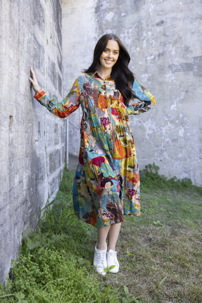 Our Collared Midi Dress is a classic silhouette perfect for any occasion. This dress features buttons through the length of the dress, three quarter sleeves, pockets, and tiered skirt, giving the dress a gorgeous feminine shape. Created using beautiful colours, prints, and fine 100% organic cotton, this dress is stylish and sustainable.