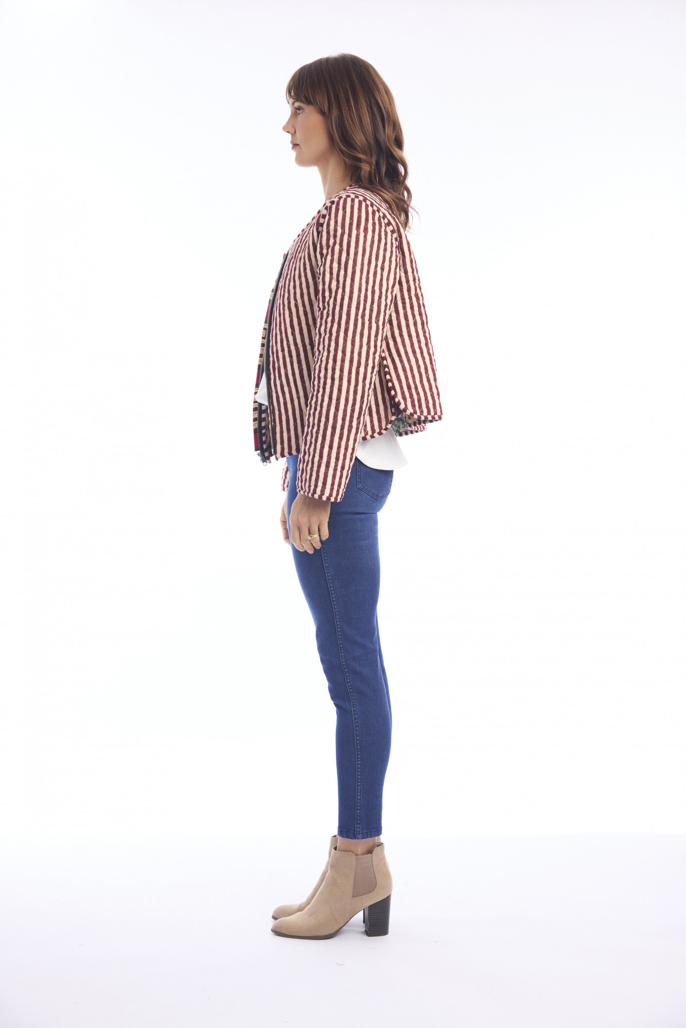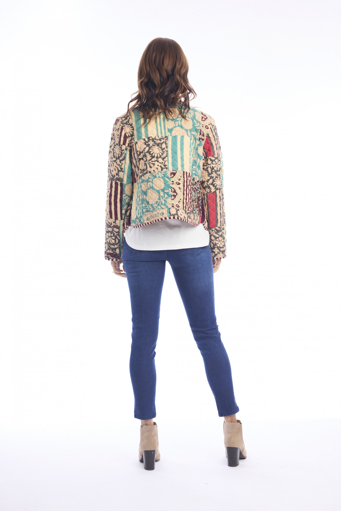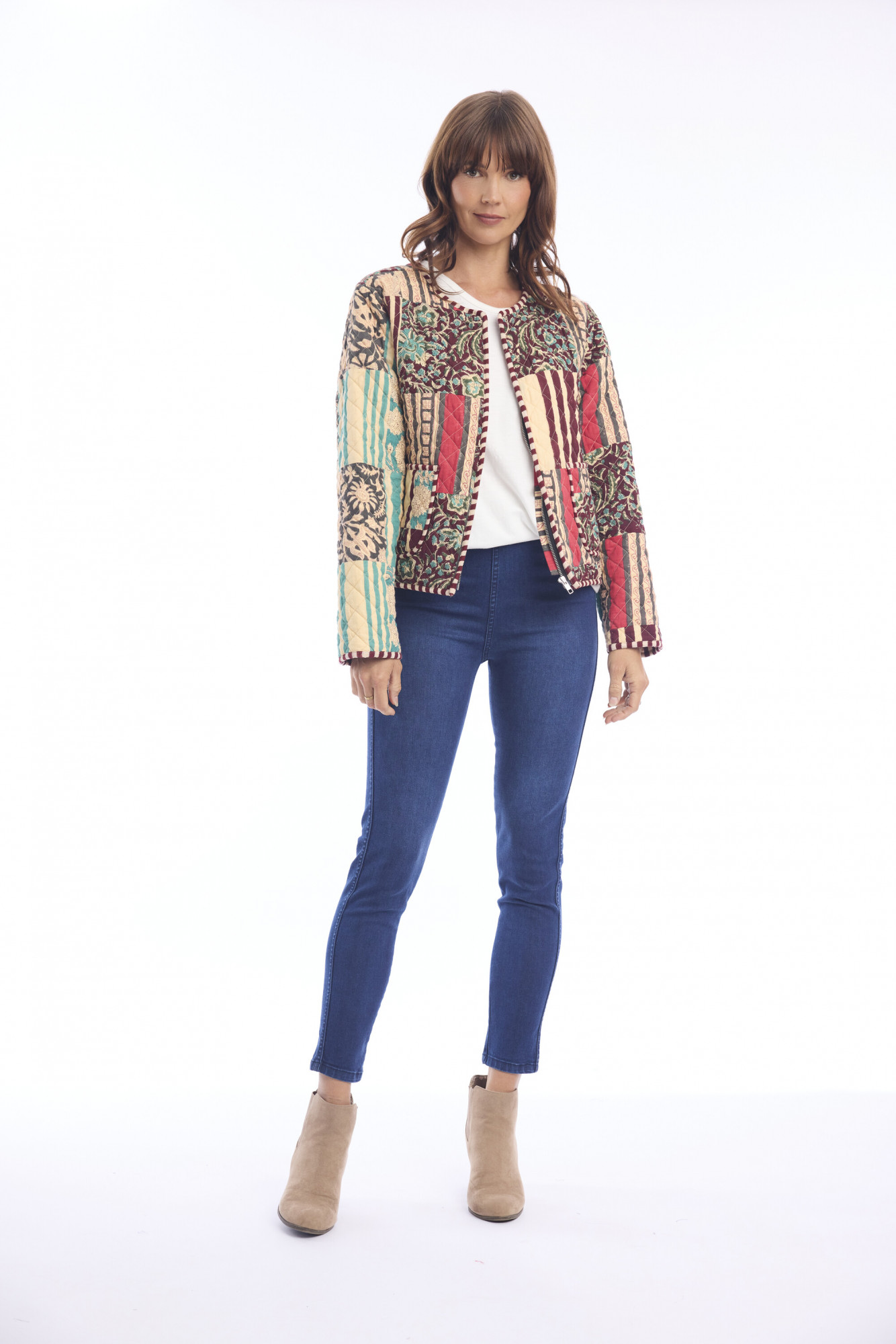 Crafted from 100% cotton, the Block Quilted Jacket brings together texture, comfort, and a modern bohemian edge. Its hip-length cut is enhanced by eclectic quilted patterning, blending stripes, florals, and geometrics in warm, artistic tones. The jacket features a round neckline and a front zipper closure, complemented by two practical front pockets. With long sleeves and a relaxed yet tailored fit, this piece combines everyday ease with statement-making style. Perfect for layering, it offers both functionality and flair in one versatile design.