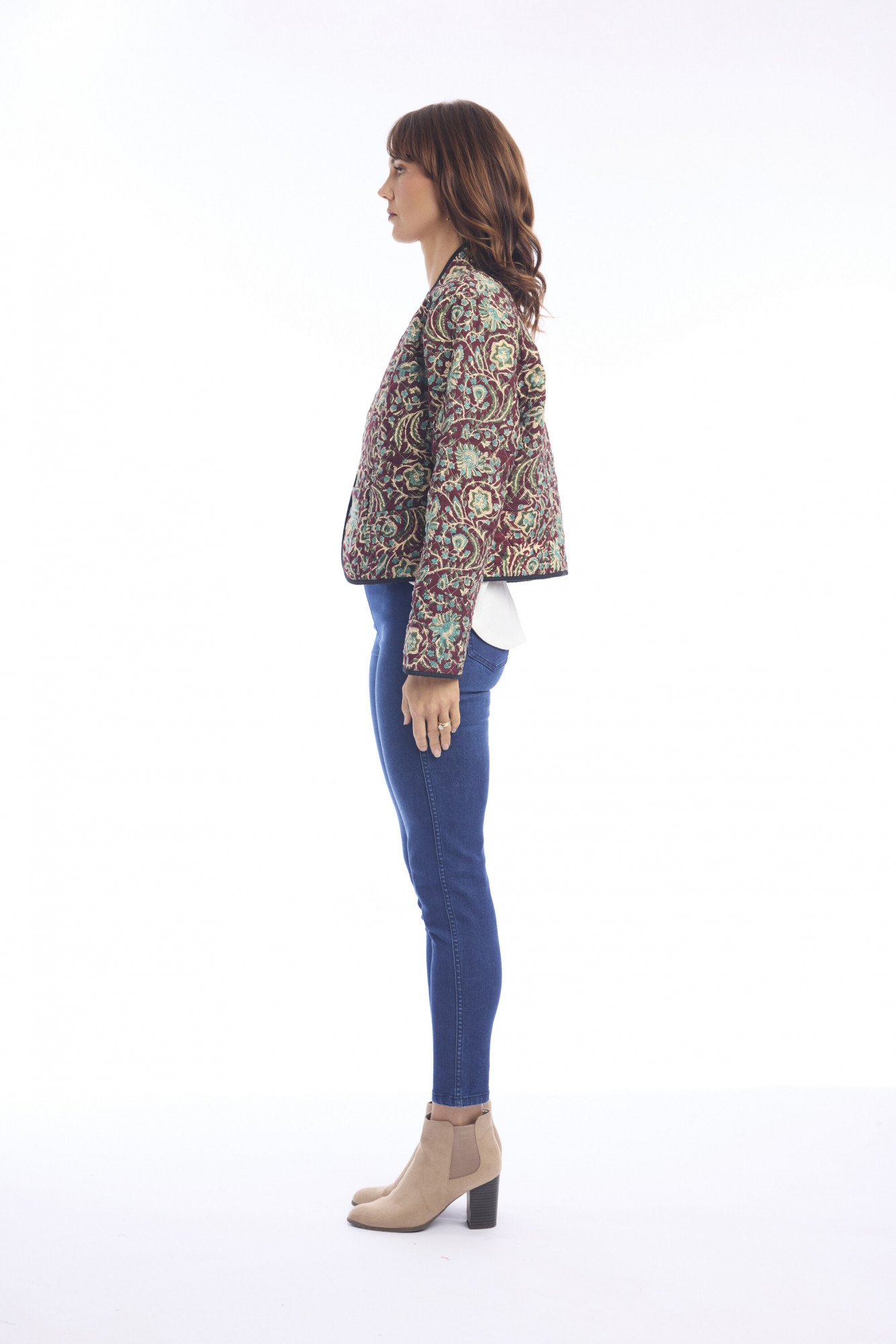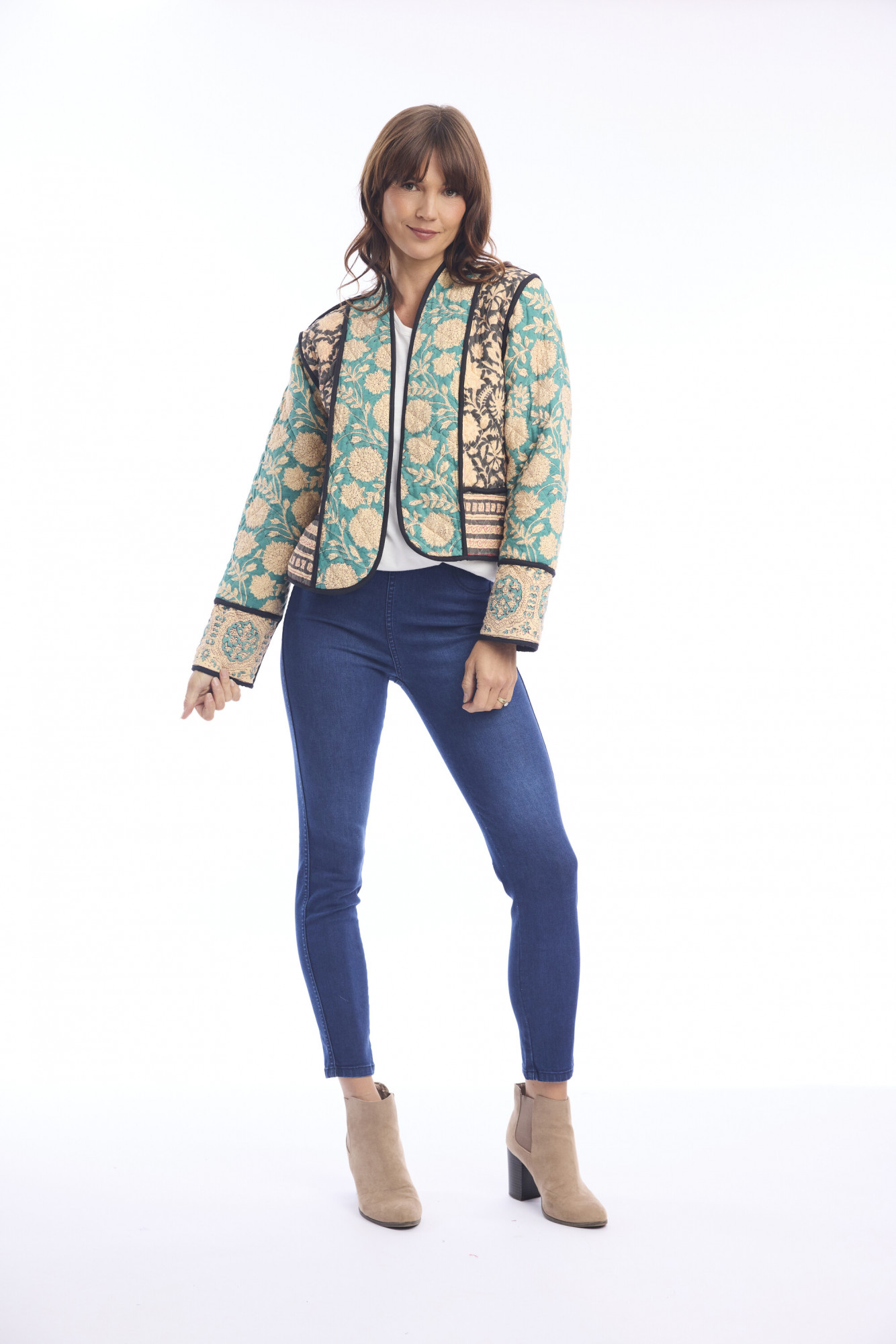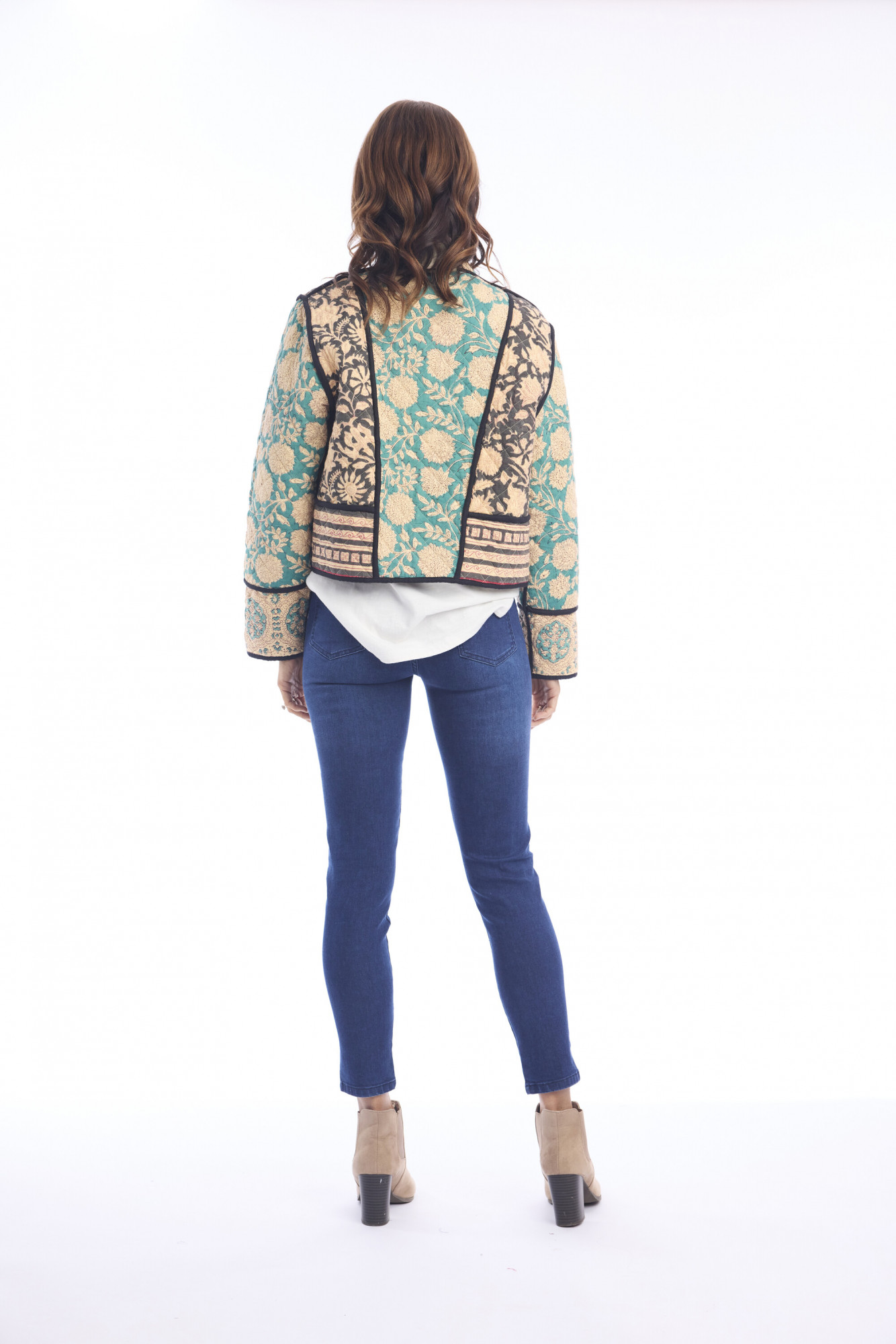 Elevate your casual wardrobe with the Block Jacket Reversible, crafted from 100% soft cotton. This hip-length, boxy jacket features a structured silhouette with long sleeves and a rounded, open neckline. Designed to be worn open, it showcases a teal base with an intricate beige and black floral pattern, while black-trimmed edges and cuffs add a polished finish. Quilted or padded for subtle volume and texture, this jacket is perfect for layering over tops and dresses for a stylish, bohemian-inspired look.