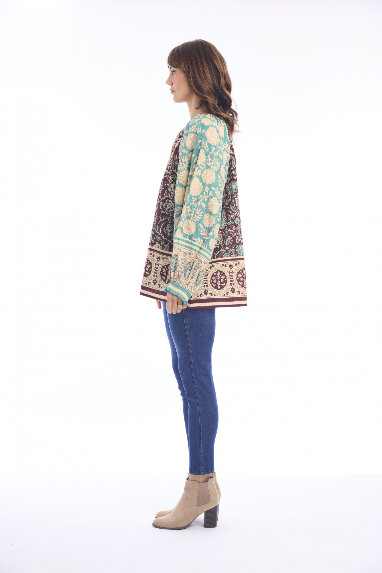 Add effortless bohemian flair to your wardrobe with the Block Top Boho, crafted from 100% lightweight cotton. This tunic-length top features a loose, flowing silhouette and long billowy sleeves gathered at the wrists with subtle ruffle detailing. A V-neckline with decorative tassels adds artisanal charm, while the vibrant mix of floral and paisley-inspired patterns—contrasting between the body and sleeves—makes this top a standout piece for casual or layered outfits.