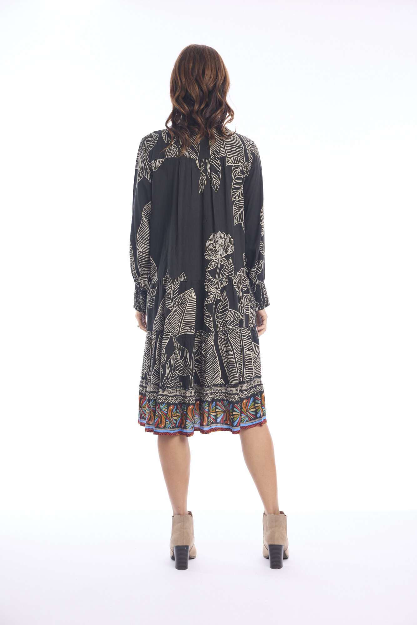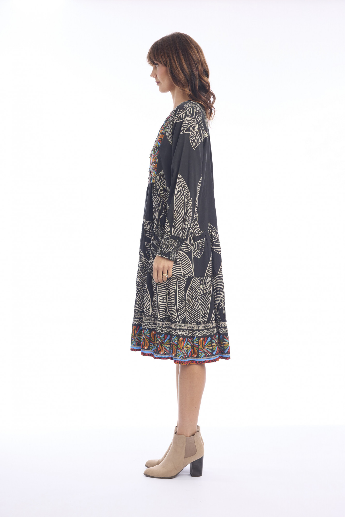 Bring vibrant artistry into your wardrobe with this flowing midi dress. Designed in a relaxed A-line silhouette with a tiered skirt, it moves effortlessly for all-day comfort. The shallow V-neckline is adorned with a placket of intricate embroidery in vivid shades of orange, red, turquoise, and yellow, featuring stylized birds and floral motifs against a black base. Long sleeves with softly gathered, elasticated cuffs add a touch of ease, while side-seam pockets lend everyday practicality. Finished with a decorative embroidered band at the hem, this piece balances bohemian charm with refined detailing.