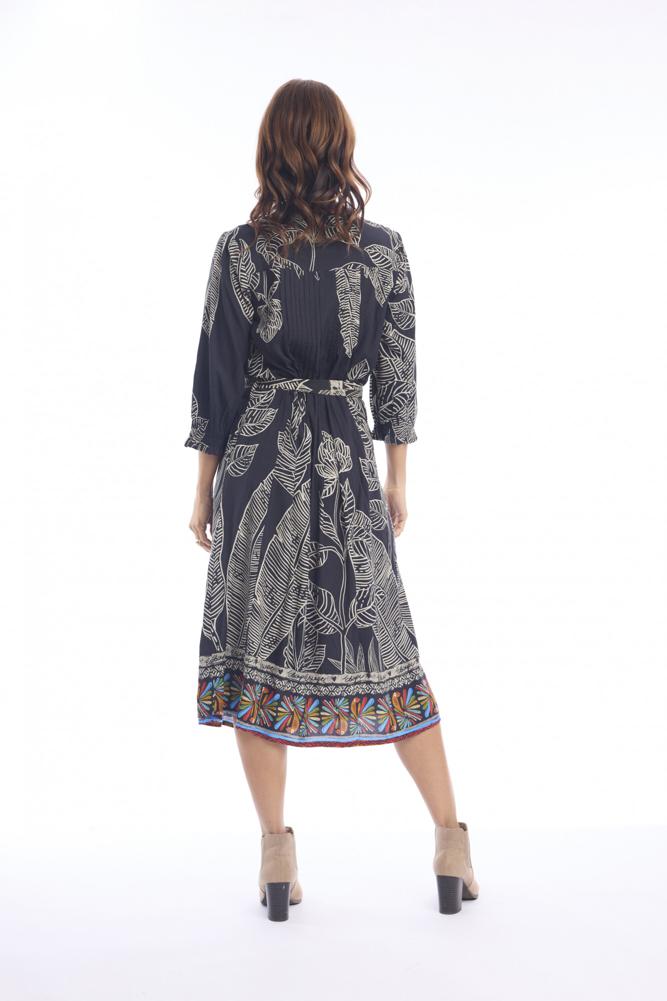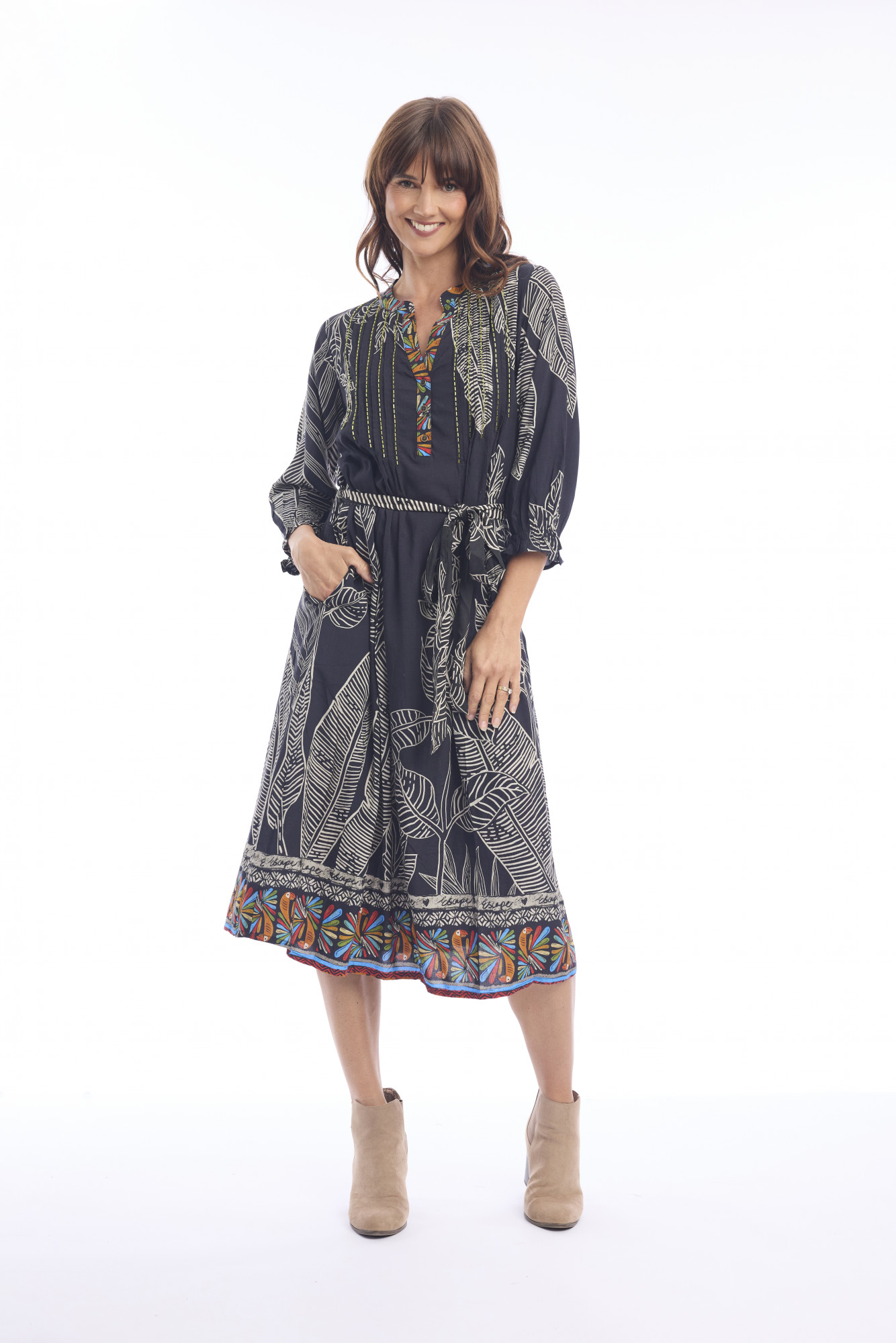 Made of 100% rayon, the Cancun Dress combines effortless elegance with a tropical flair. This midi-length style features a mandarin collar that flows into a V-neckline, complemented by three-quarter sleeves gathered with elastic at the cuffs. Pleated details at the shoulder add subtle texture, while a matching belt cinches the waist for a flattering silhouette. Designed with practical side pockets and a gently flared hemline, creating a bold yet versatile look.