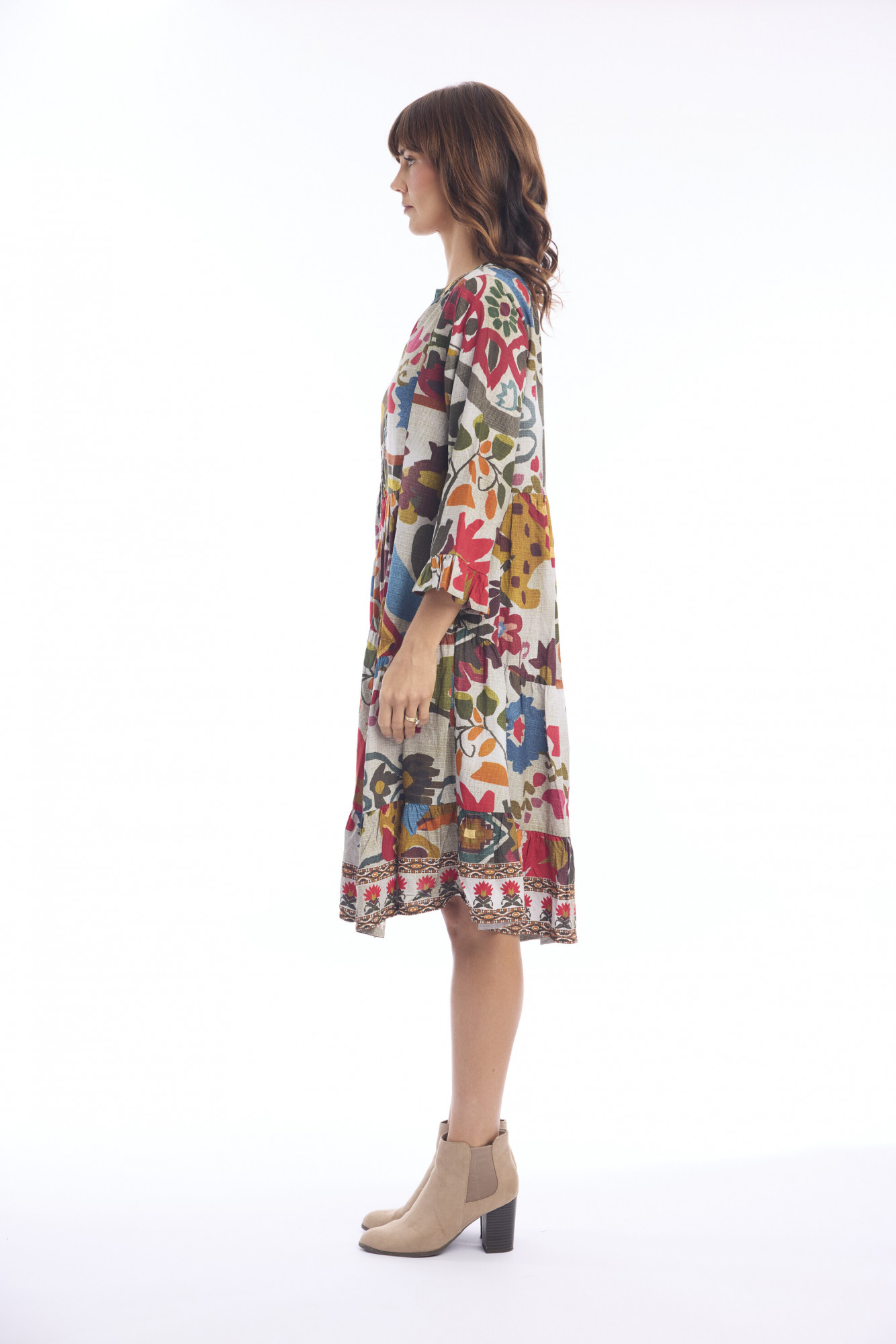 Crafted from 100% rayon, the Chateau Eza Dress blends casual ease with bohemian charm. Designed with a relaxed fit that flares gently from the waist, it features a classic V-neckline and a button-down front for adjustable styling. The three-quarter sleeves are finished with ruffled cuffs, adding a feminine detail. A matching belt cinches the waist for shape, while the mid-calf length skirt is highlighted by a decorative patterned band along the hem. The vibrant print mixes warm tones of red, yellow, and orange with cool shades of blue and green, creating a striking, artistic look.