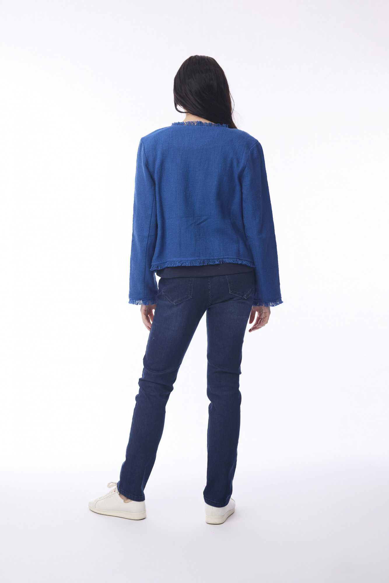A stylish and versatile 100% cotton jacket featuring a short, open-front design with a rounded neckline and long sleeves. The jacket is finished with frayed edge detailing on the neckline, front, and cuffs, adding a subtle touch of texture. Perfect in a variety of colours, prints, or solid patterns, this piece is ideal for layering and adding effortless style to any outfit.