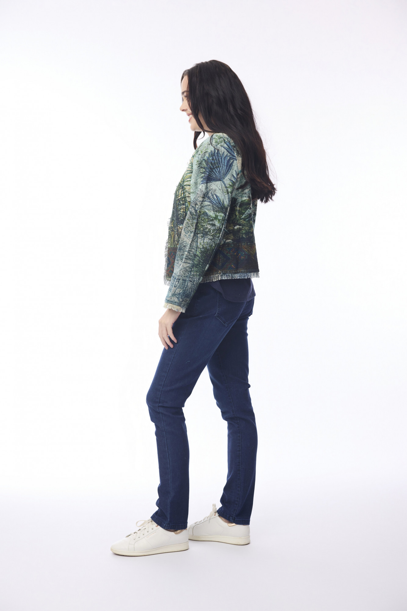 A stylish and versatile 100% cotton jacket featuring a short, open-front design with a rounded neckline and long sleeves. The jacket is finished with frayed edge detailing on the neckline, front, and cuffs, adding a subtle touch of texture. Perfect in a variety of colours, prints, or solid patterns, this piece is ideal for layering and adding effortless style to any outfit.