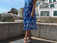 Brighten up your summer wardrobe with our stunning Comodoro Blue dress. Featuring a flattering v-neckline, buttons at the bust, cap sleeves, and pleats at the waist that fall into a knee-length skirt, this piece is perfect for any occasion. This is your new go-to summer dress!