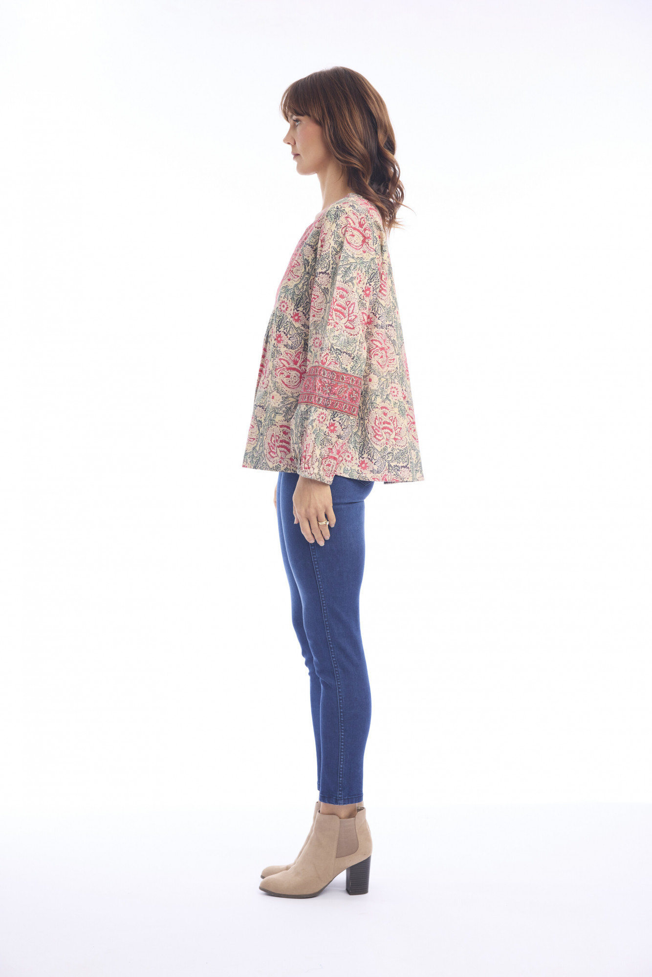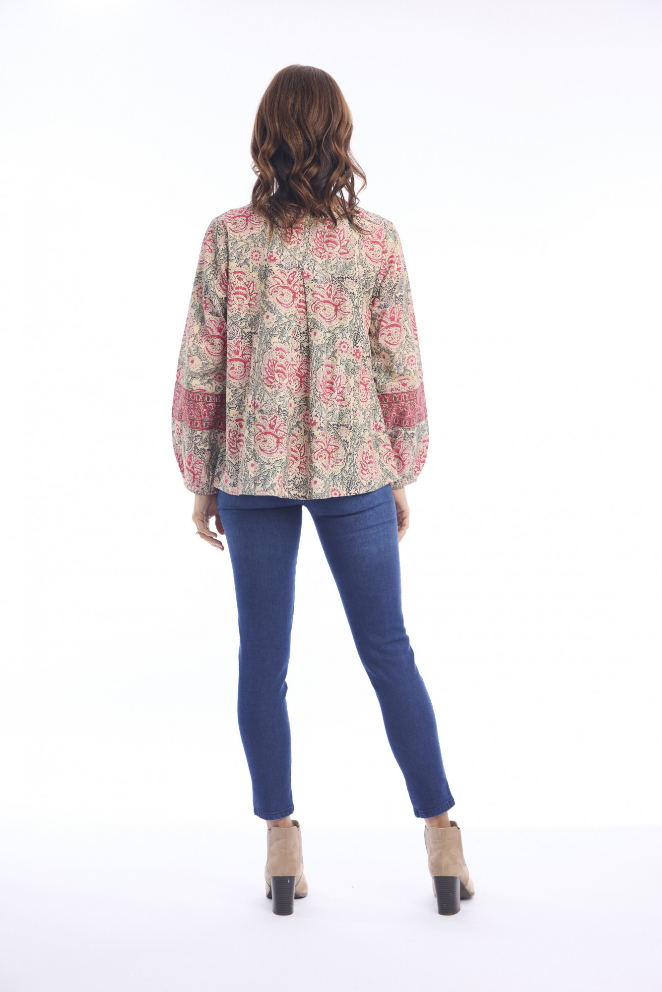 Bring relaxed bohemian style to your wardrobe with the Comporta Top V Neck, crafted from 100% soft cotton. This hip-length blouse features a slightly loose, flowing fit with long sleeves gathered at the wrists for a subtle balloon effect. The V-neckline is accented with intricate detailing, mirrored on the sleeves, while the multi-colored patterned fabric adds a vibrant, artisanal touch—perfect for pairing with skirts, pants, or layering under jackets.