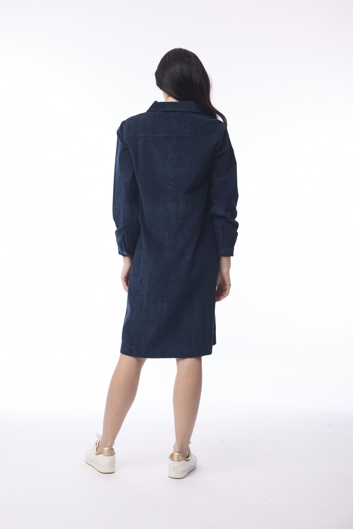 Effortlessly blending comfort and style, the Cord Solid Dress is crafted from 100% cotton with soft vertical ribs for a textured finish. Designed with a collared neckline and subtle V-neck opening, it features two visible buttons for a refined touch. Long cuffed sleeves add structure, while two large patch pockets at the front provide both style and practicality. Falling just above the knees, this dress is perfect for everyday wear with a polished edge.