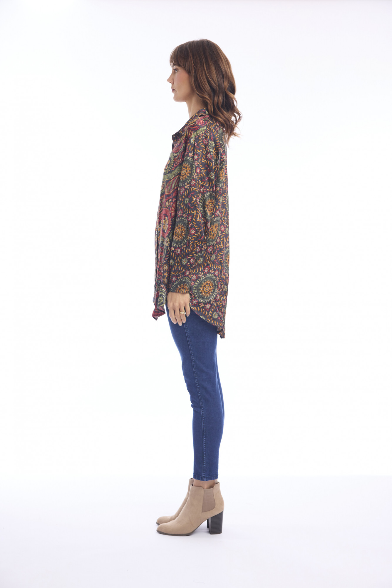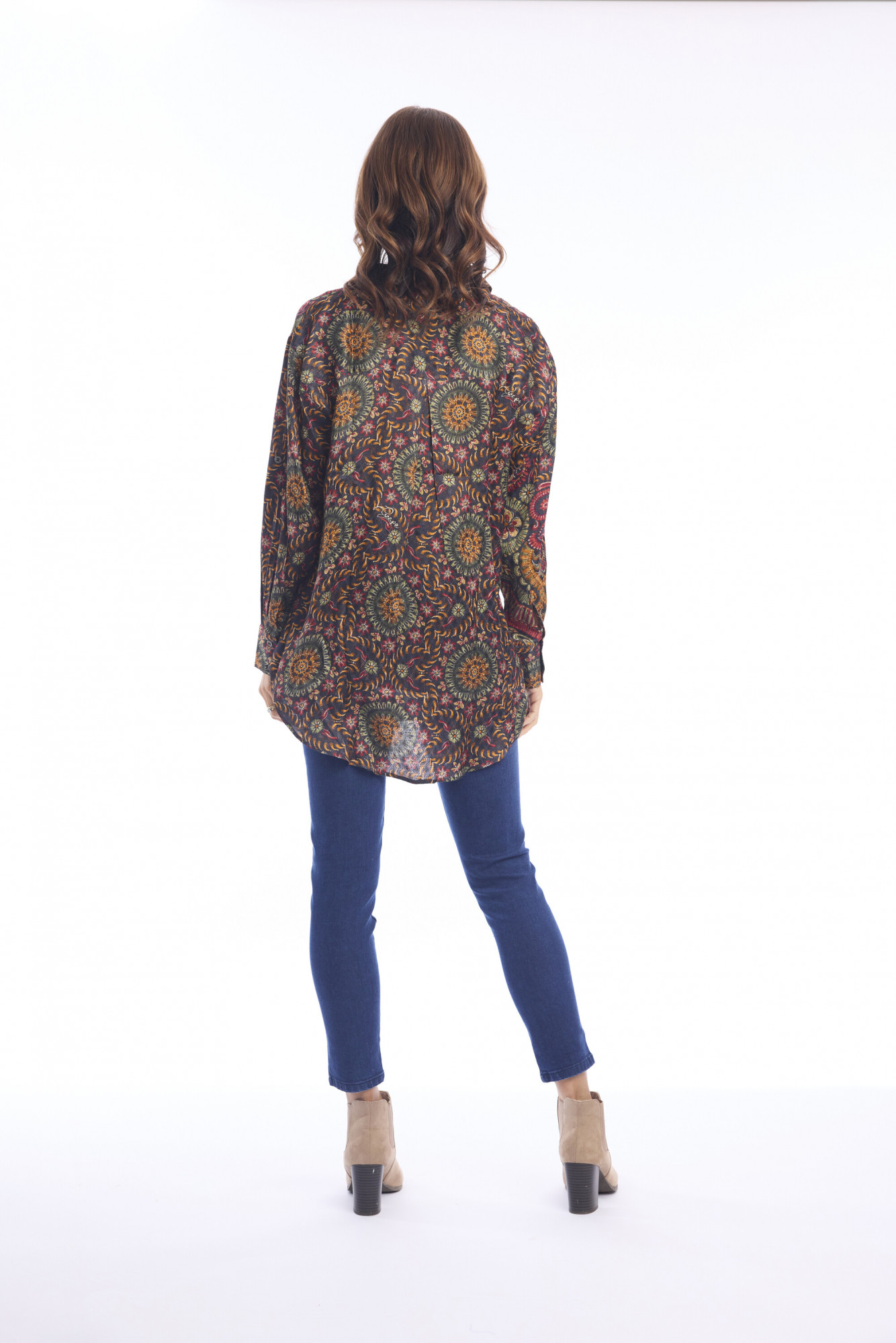 Made of 100% rayon, this shirt blends timeless comfort with modern bohemian flair. Designed with a relaxed silhouette, it features a classic button-down front, long sleeves with cuffs, and a collared neckline for effortless style. The hemline is accentuated with a decorative border that adds a touch of detail and distinction, making it versatile for both casual and elevated looks.