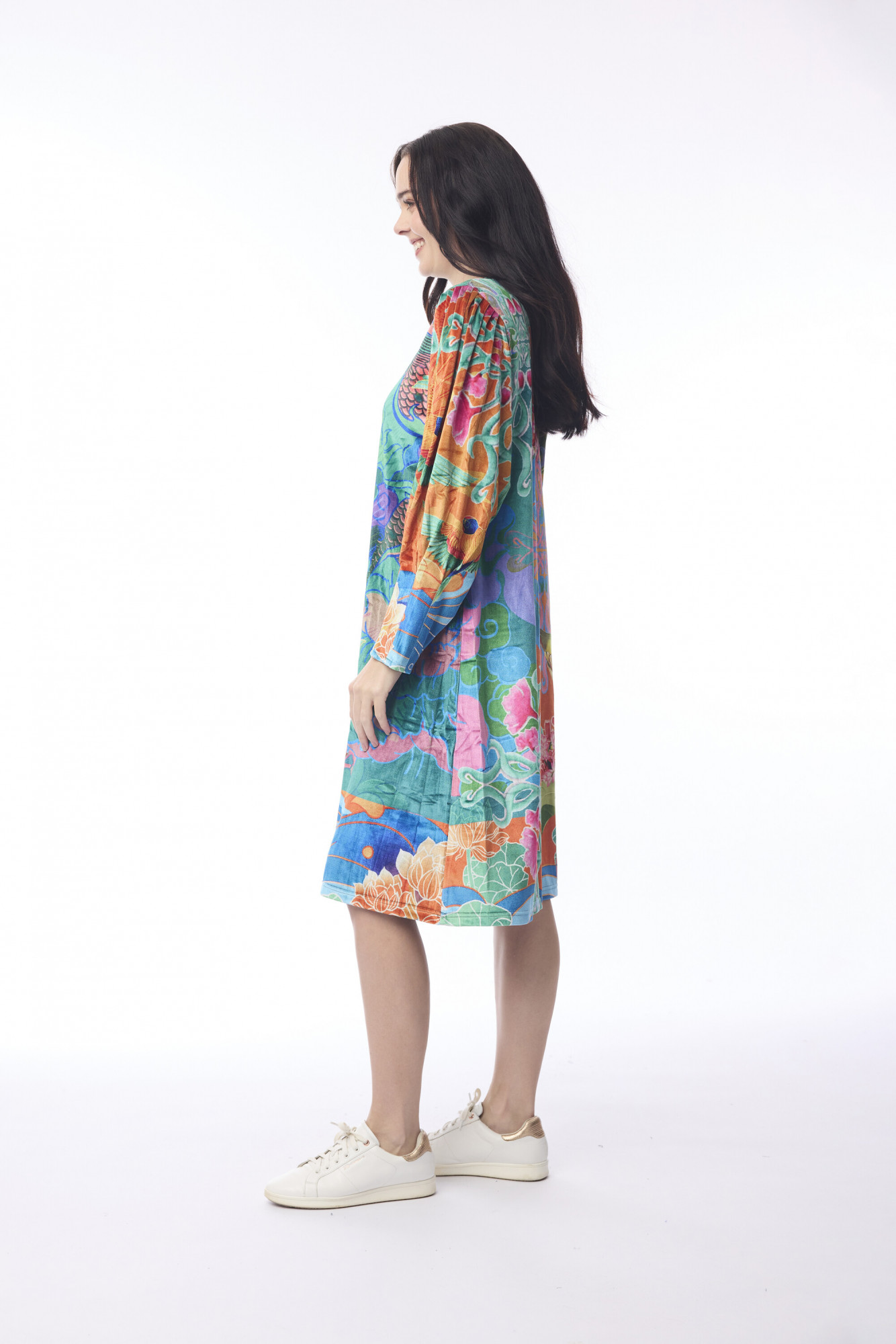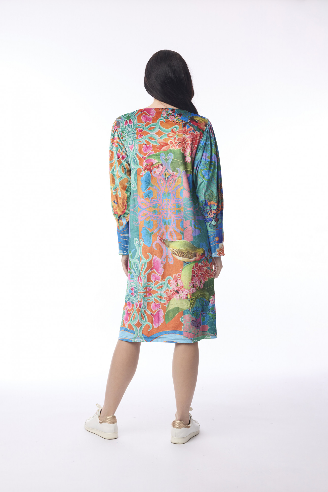 Designed for effortless elegance, this dress is crafted from soft polyester and cut in a flattering A-line silhouette. It features a round neckline and long gathered sleeves that add subtle volume and a touch of sophistication. Perfect for both casual outings and polished occasions, this piece blends comfort with refined style.