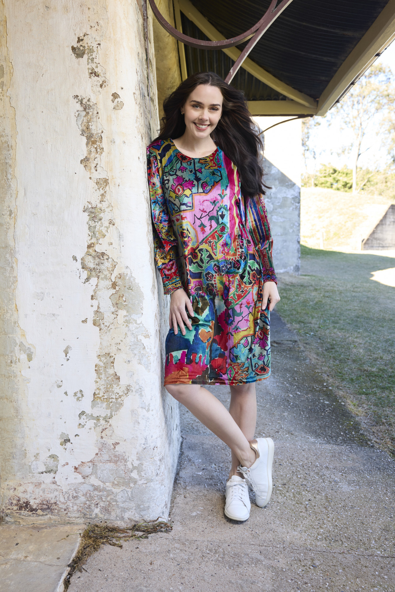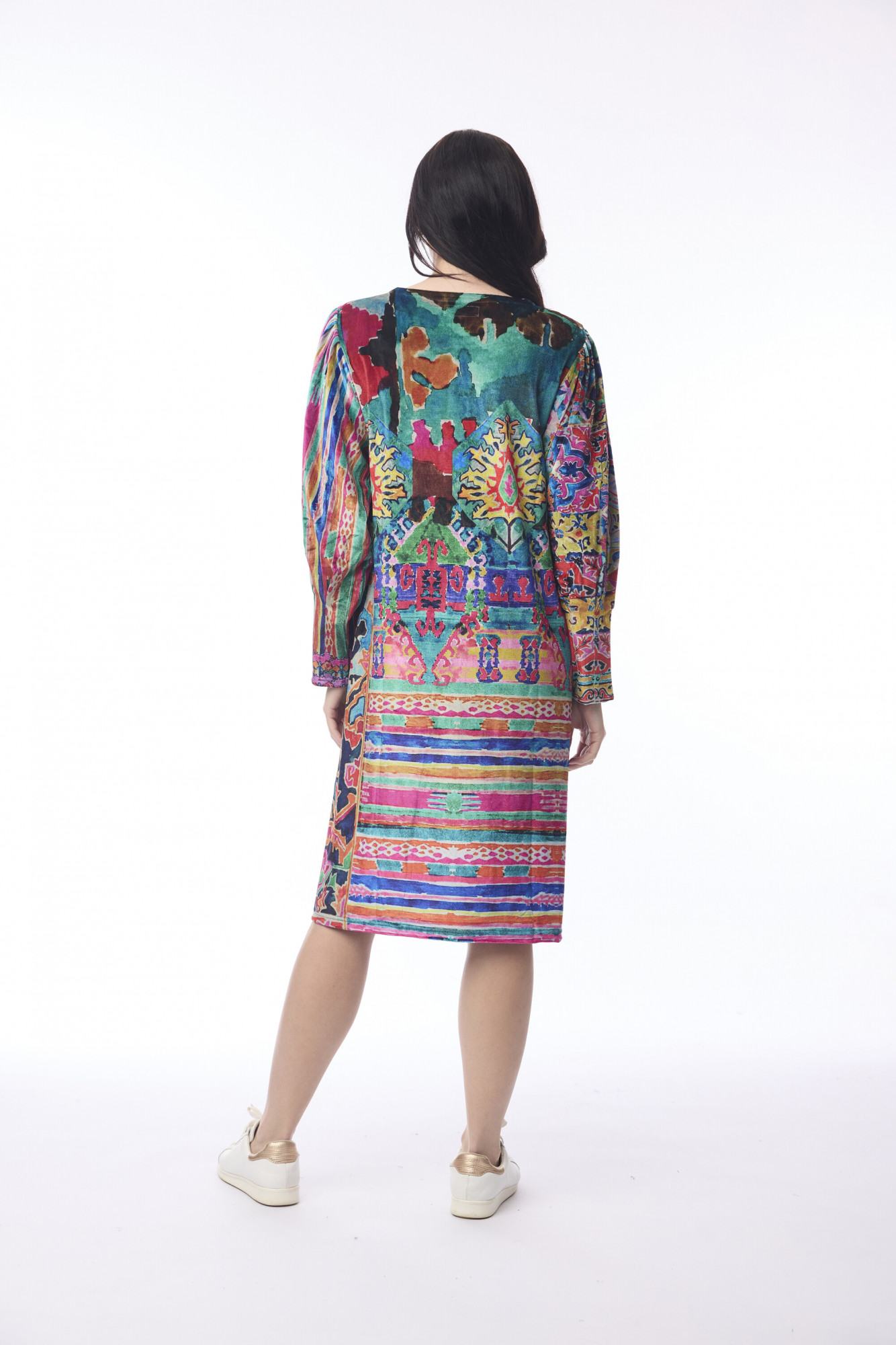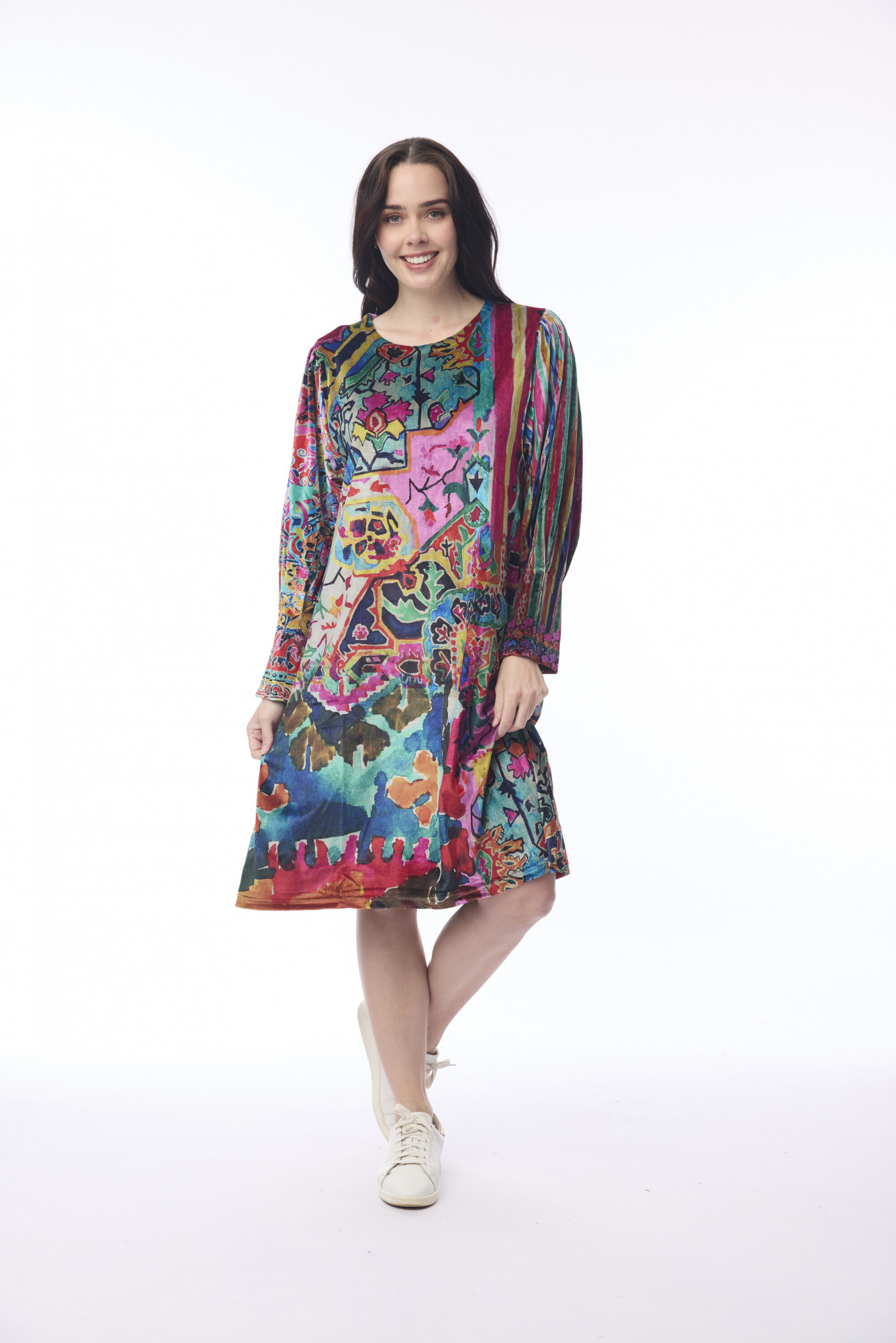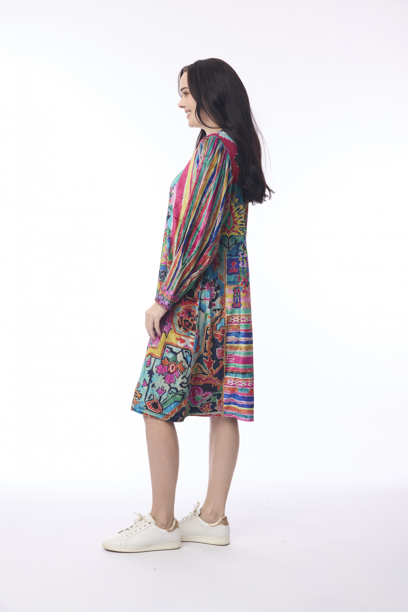 Designed for effortless elegance, this dress is crafted from soft polyester and cut in a flattering A-line silhouette. It features a round neckline and long gathered sleeves that add subtle volume and a touch of sophistication. Perfect for both casual outings and polished occasions, this piece blends comfort with refined style.