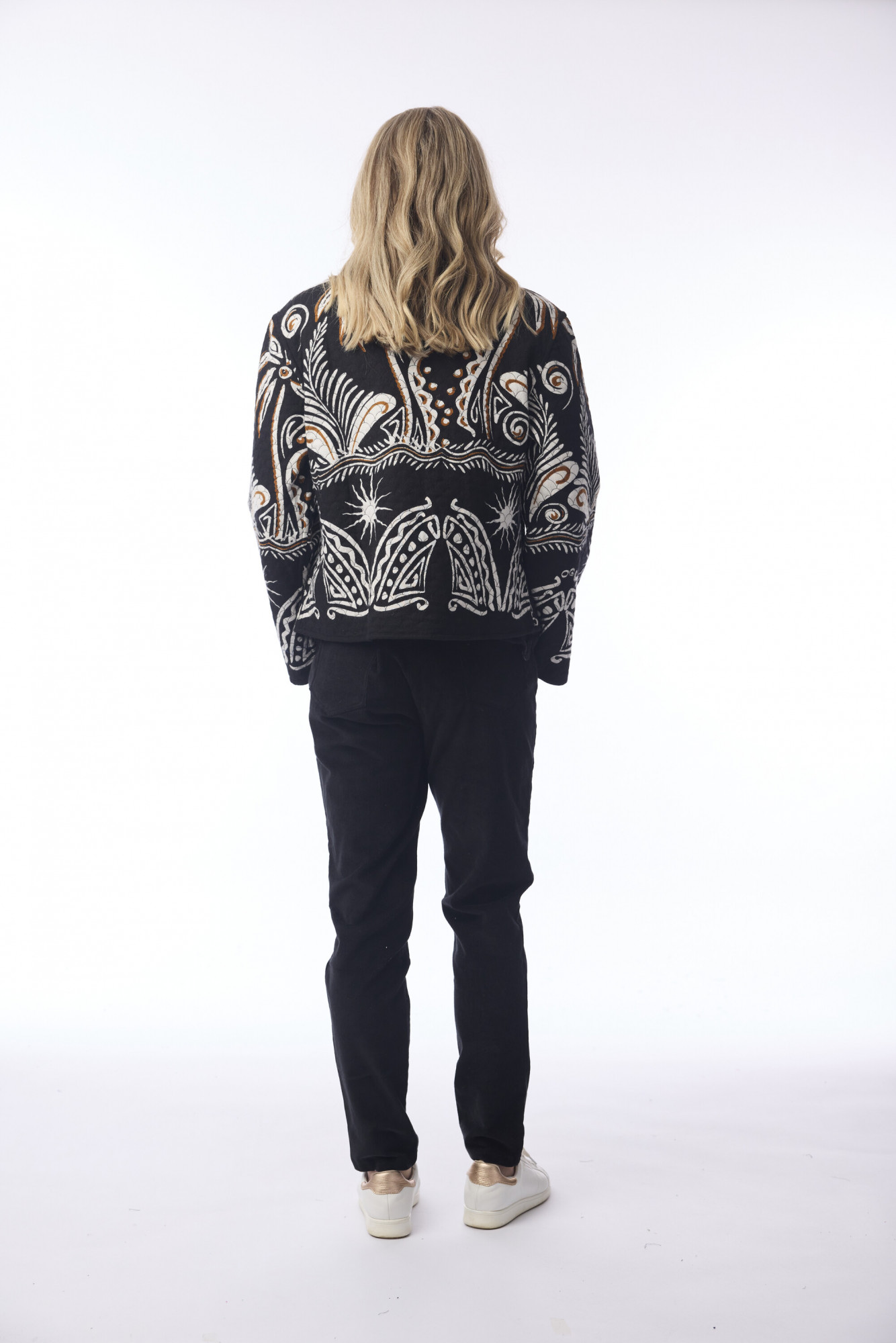 Made from 100% cotton, this mid-length jacket features a relaxed, slightly oversized fit with long sleeves and a draped shawl-style collar. The jacket is adorned with an intricate floral and paisley-inspired pattern, adding subtle texture and visual interest. Two small welt pockets sit at the waist, while the rounded neckline and casual yet elegant silhouette make it versatile for a variety of occasions.