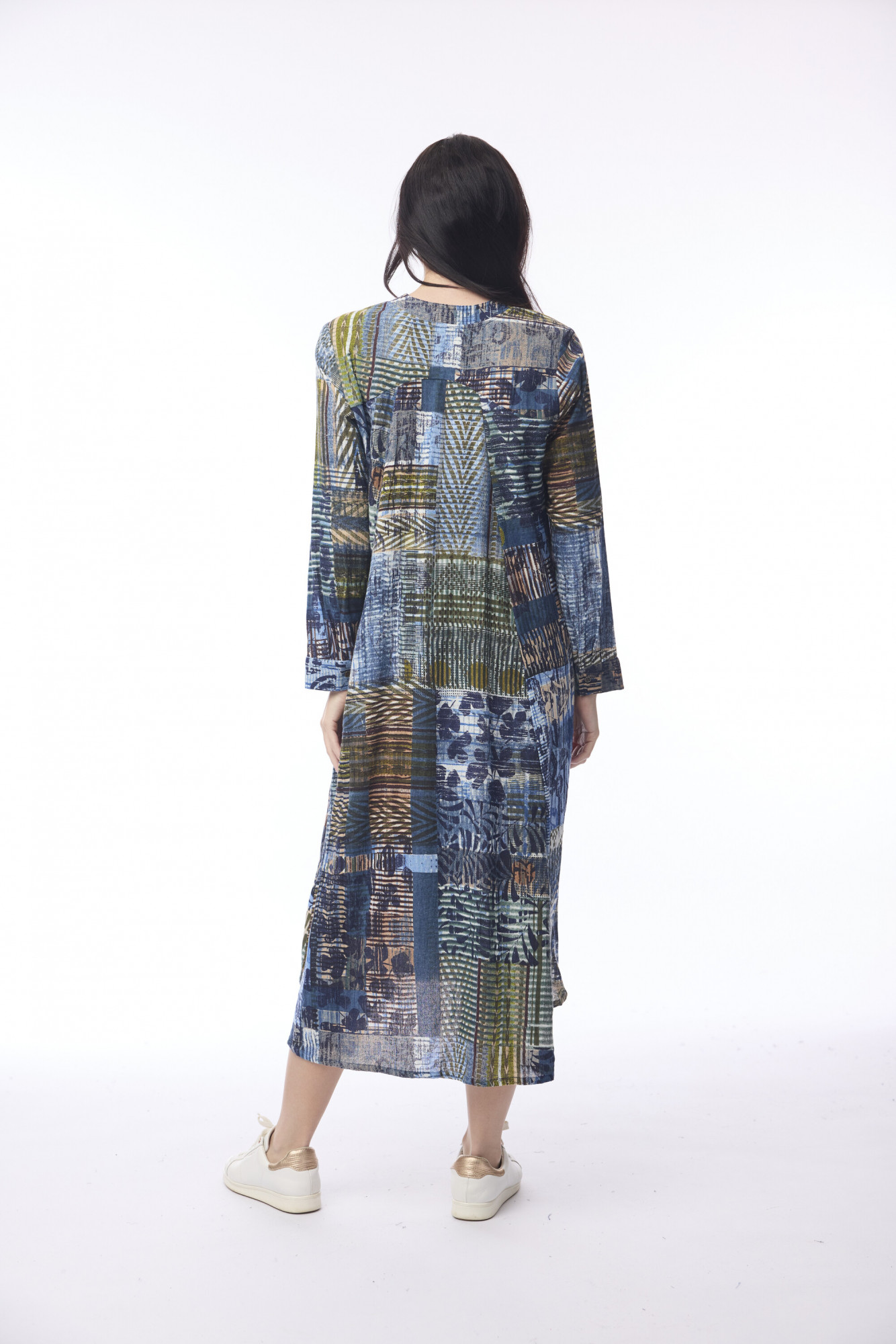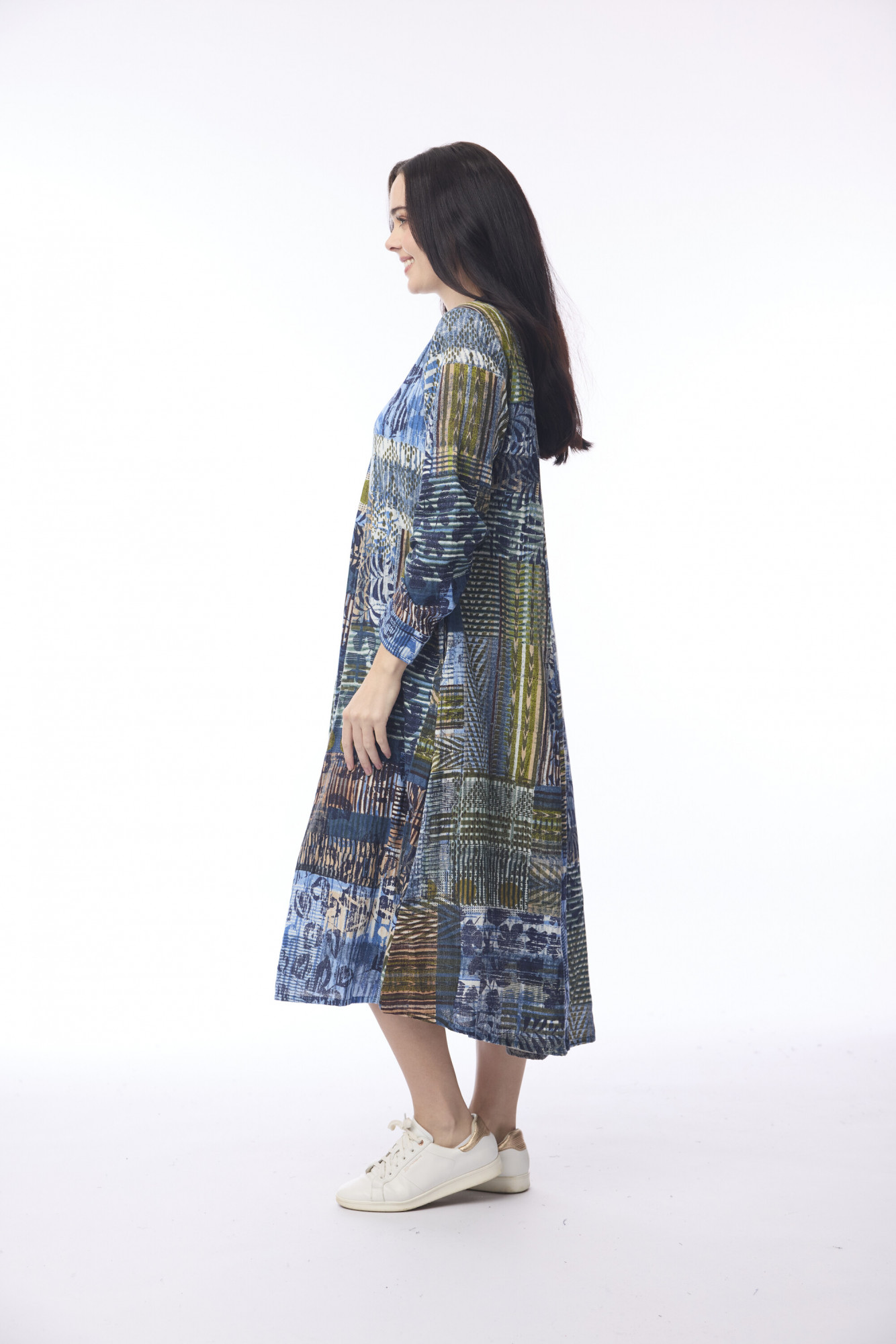 Made from 100% cotton, this Isfahan Dress Maxi V features a relaxed, slightly flared A-line silhouette with long sleeves and a flattering V-neckline. The fabric is smooth and drapes elegantly, showcasing a vibrant, multicolored abstract print in a layered, patchwork-inspired design. Comfortable yet stylish, it’s perfect for everyday wear or casual outings.