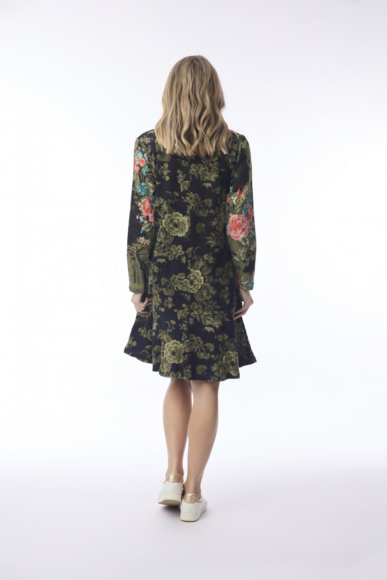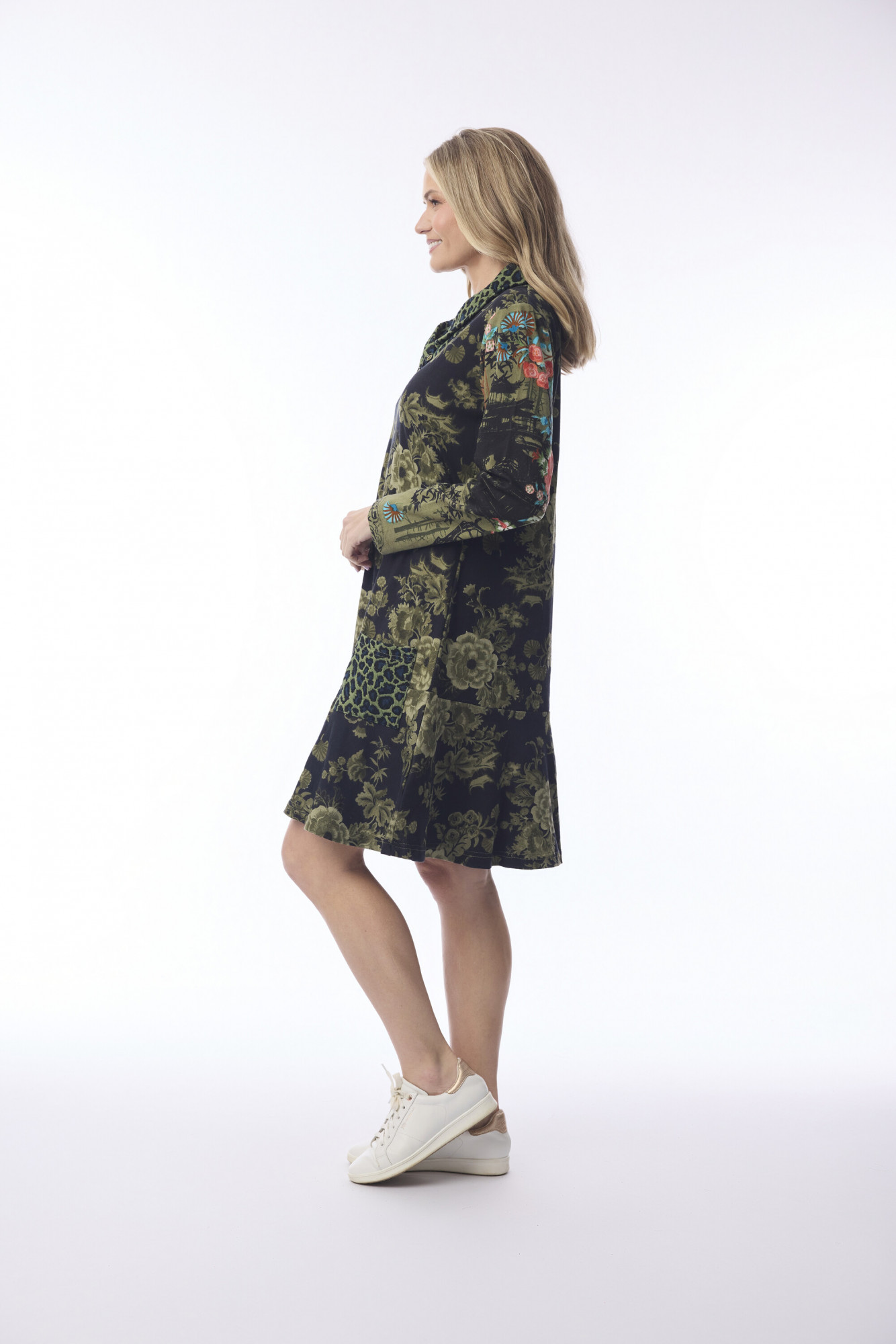 The Keqioa Tunic Cowl Neck blends artistic flair with effortless comfort. Crafted from 100% cotton, this knee-length tunic features a relaxed A-line silhouette and long sleeves for a flowing, flattering fit. A soft cowl neckline drapes beautifully, revealing subtle decorative buttons, while the bold mix of green botanical, floral, and animal-inspired prints creates a dynamic, bohemian aesthetic. An exposed metallic zipper at the front adds an unexpected edge, making this tunic perfect for statement everyday wear.