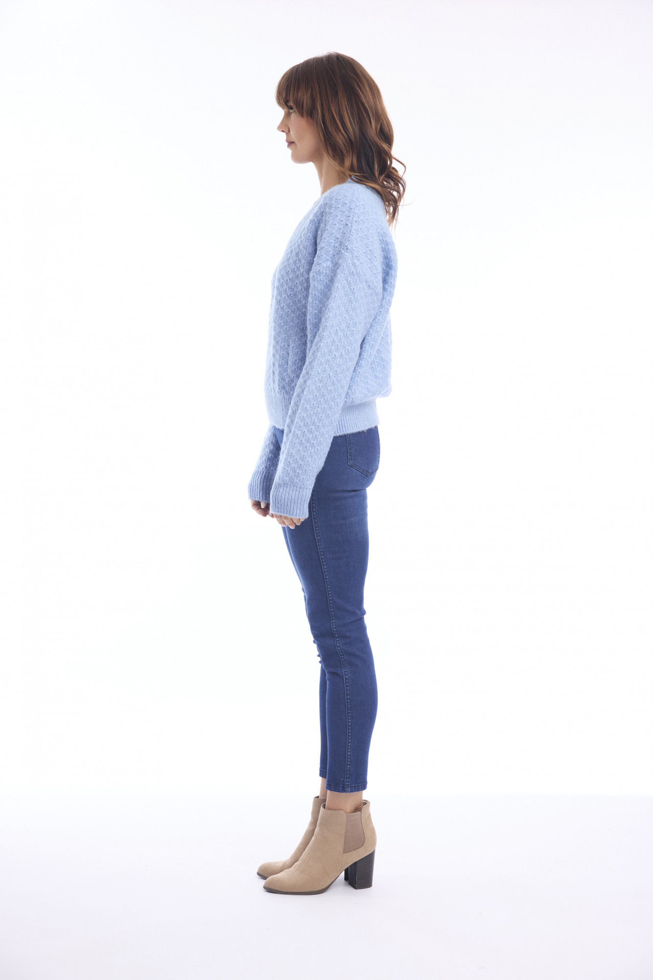 Indulge in the luxurious softness of this 100% wool knitted jumper, crafted for both warmth and style. The breathable wool fabric provides natural insulation, making it an ideal layering piece for cooler seasons. Designed with a patterned knit, V-neckline, and long sleeves, it combines timeless elegance with everyday comfort. Ribbed detailing at the collar, cuffs, and hem adds a refined finish, while the artisanal knit texture elevates its charm. Perfect for pairing with tailored trousers or casual denim, this jumper is a versatile wardrobe essential that blends coziness with sophistication.