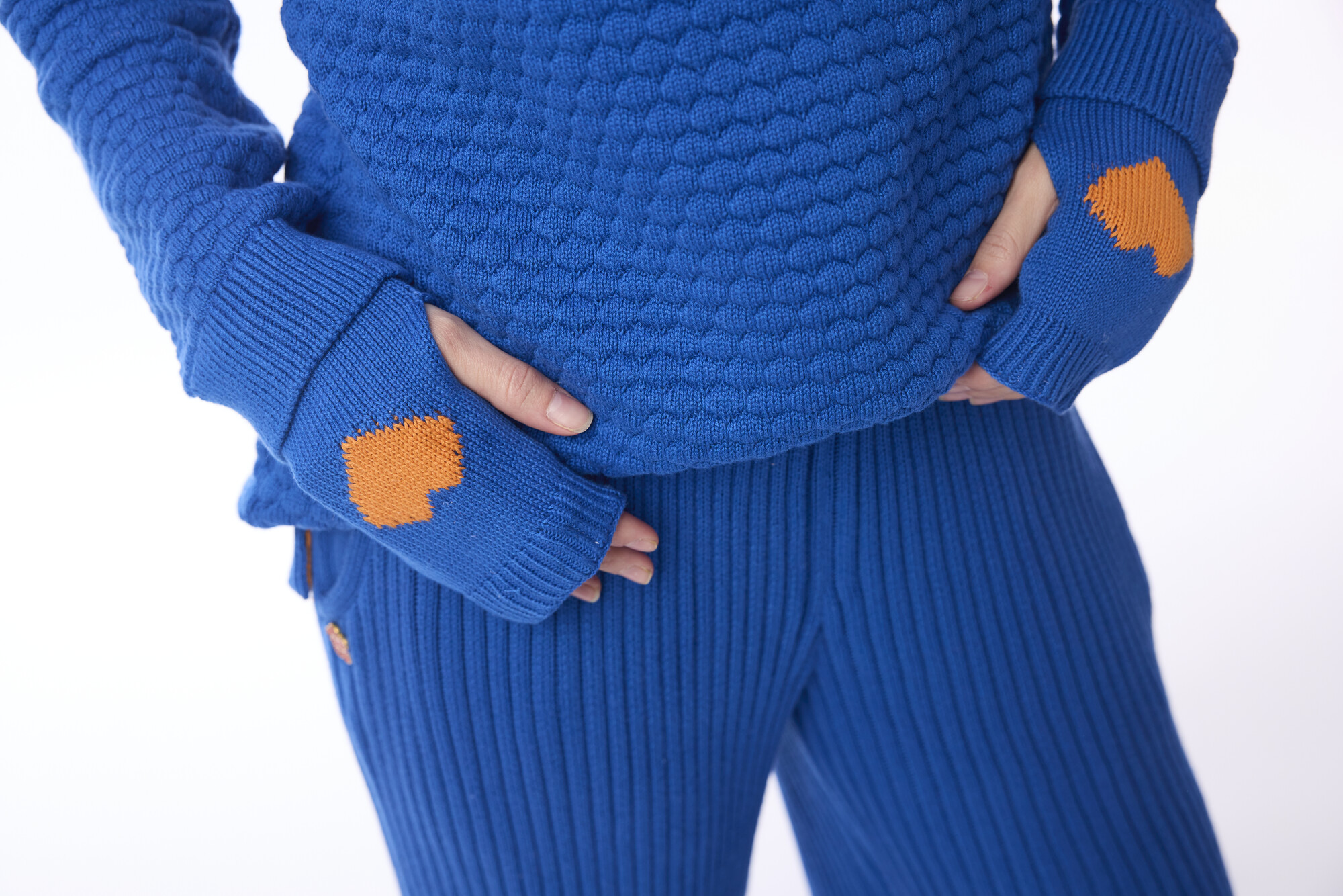 These fingerless knit gloves combine style and functionality in a cozy, textured design. Crafted from soft, knitted material, they feature a ribbed cuff for a snug fit at the wrist and a thumb opening for easy movement. The main hand area showcases a raised, textured knit pattern, while a contrasting heart-shaped patch adds a playful accent. Perfect for layering with matching sweaters or wearing solo, these gloves provide warmth and flexibility without restricting finger movement.