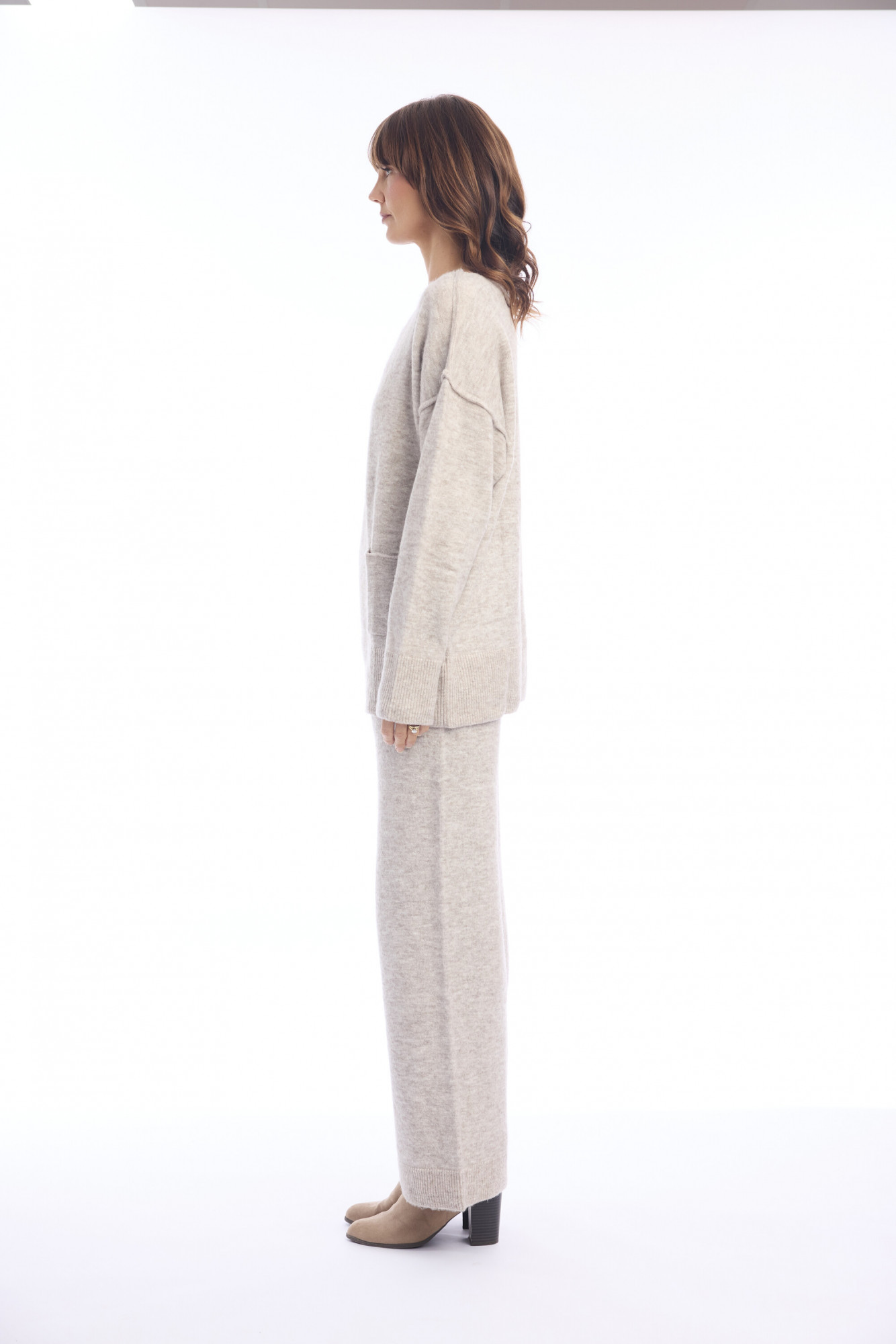 Elevate your loungewear and casual style with this matching knit set. Crafted from a soft and textured blend of acrylic, nylon, wool, and Lycra, the set offers both comfort and stretch. The top features a relaxed boat neck design with long sleeves, while the high-waisted, wide-leg pants flow elegantly from the hips to the floor. Perfect for cozy days at home or effortless street style, this versatile set combines chic minimalism with everyday ease.
