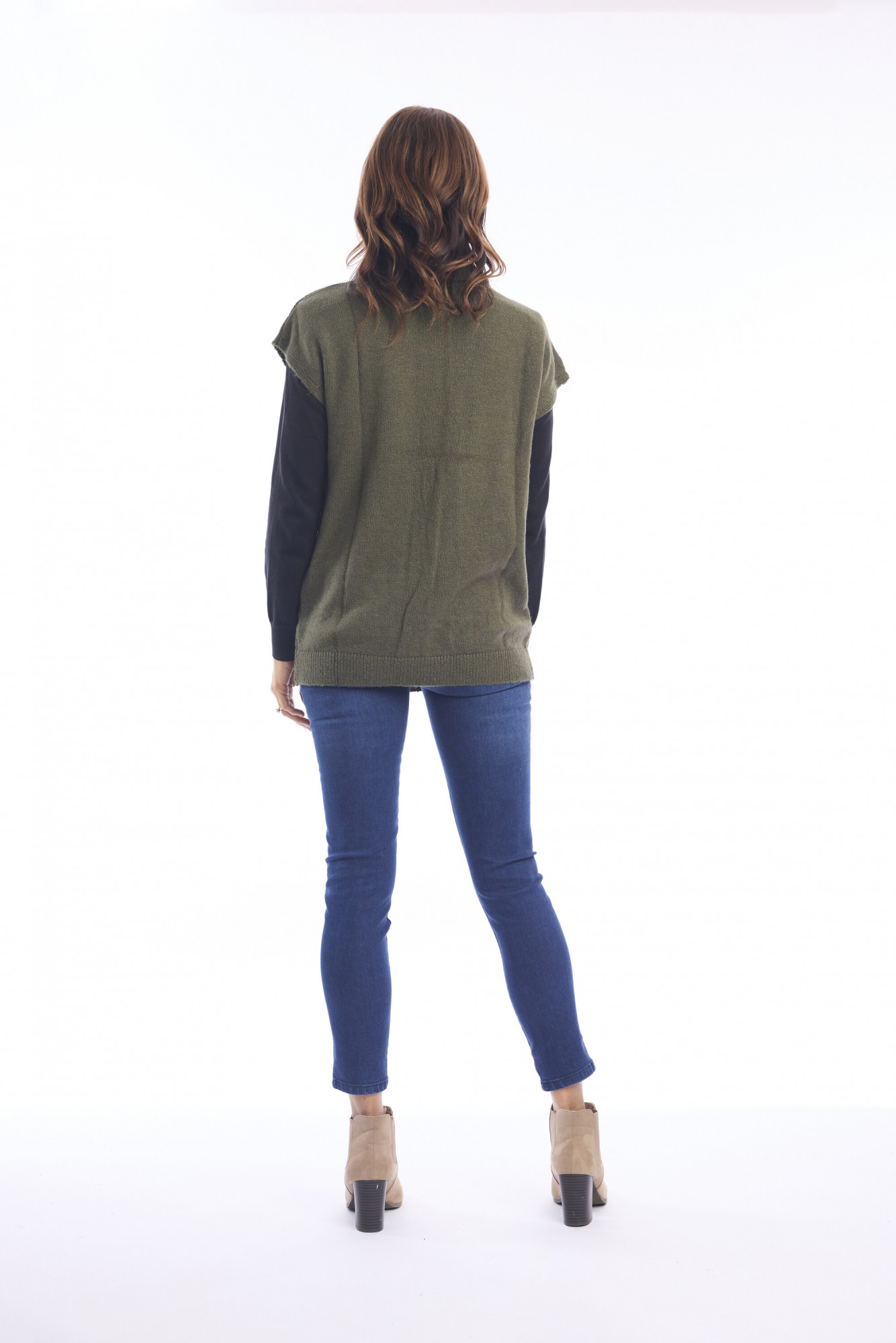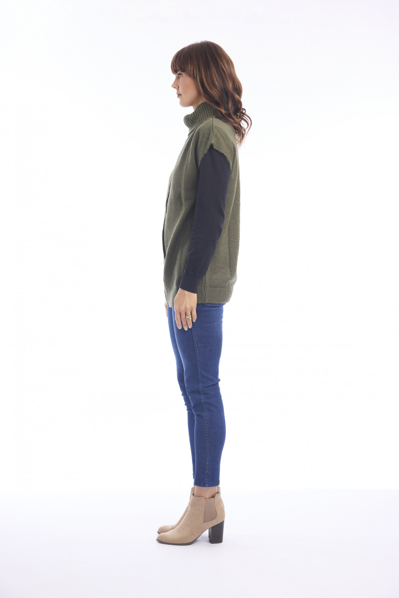 Made of 100% wool, this knit sweater vest is designed for cozy sophistication. Featuring a high, close-fitting turtleneck collar, the neckline sits snugly against the neck for warmth and style. The cap sleeves add a modern, relaxed touch, while the hip-length cut ensures a versatile fit. A subtle vertical seam runs down the center front, giving the vest a clean-lined, minimalist look. Crafted from medium-weight wool, the vest is soft, warm, and perfect for layering or wearing on its own.