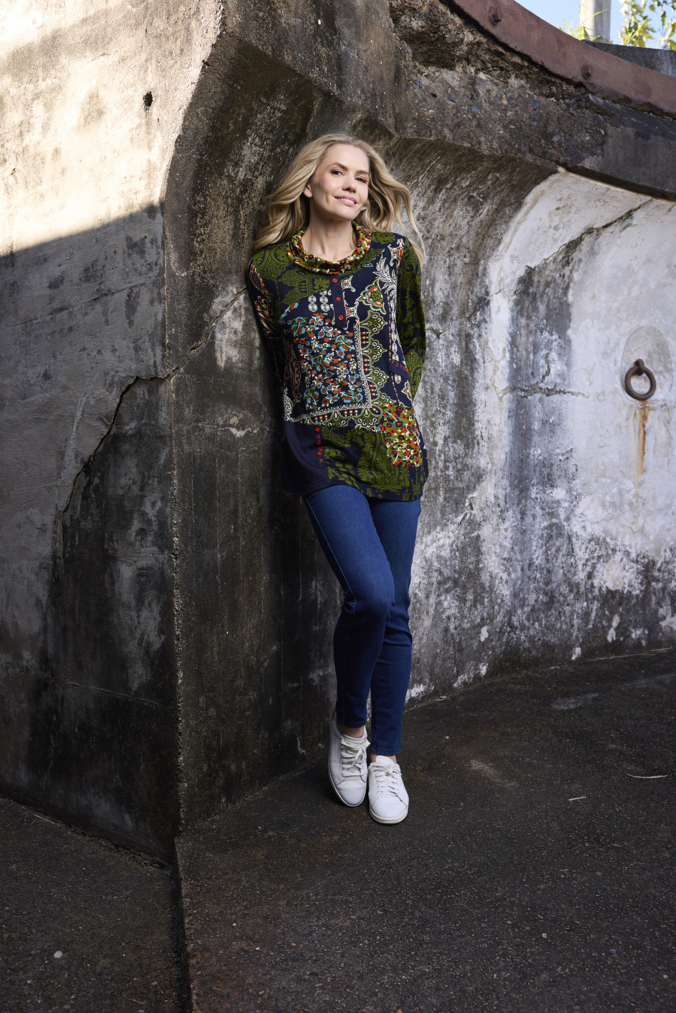 Add effortless elegance to your winter wardrobe with the Kumbalgharh Cowl Neck Top. Designed with a graceful cowl neckline and relaxed fit, it drapes beautifully for a flattering silhouette. Crafted from 100% cotton, it feels soft and cosy against the skin, while vibrant patchwork prints and rich colours infuse every outfit with style and personality.