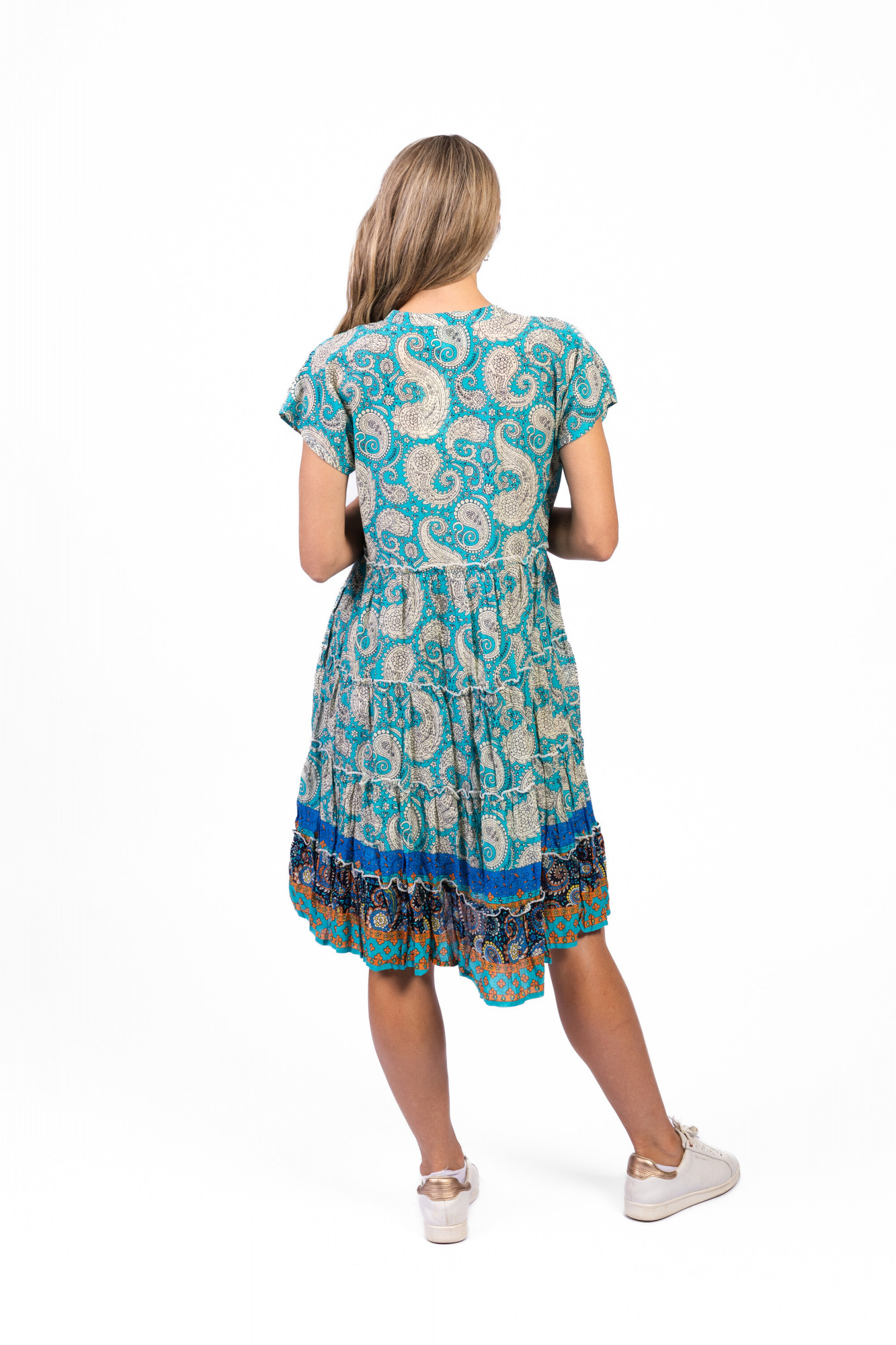 Bring effortless charm to your warm-weather wardrobe with the Leela V Neck Mini Dress. Crafted from lightweight, breathable 100% cotton, this mini dress features a playful, relaxed silhouette with a V-neckline and partial button placket for easy wear. The soft, short sleeves enhance the breezy feel, while the multi-tiered design creates volume and movement with every step. Whether you're heading to a brunch, beachside stroll, or a casual day out, this vibrant smock dress offers all-day comfort with a free-spirited, bohemian flair. Its vivid color palette and flowing shape make it the perfect throw-on-and-go piece for summer