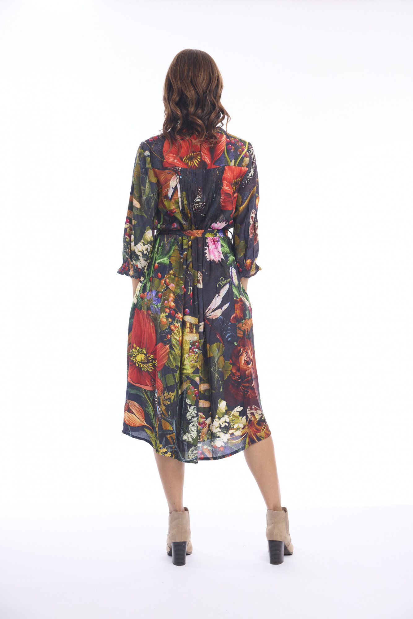 Made of 100% rayon, the Maguana Dress combines effortless elegance with a tropical flair. This midi-length style features a mandarin collar that flows into a V-neckline, complemented by three-quarter sleeves gathered with elastic at the cuffs. Pleated details at the shoulder add subtle texture, while a matching belt cinches the waist for a flattering silhouette. Designed with practical side pockets and a gently flared hemline, creating a bold yet versatile look.
