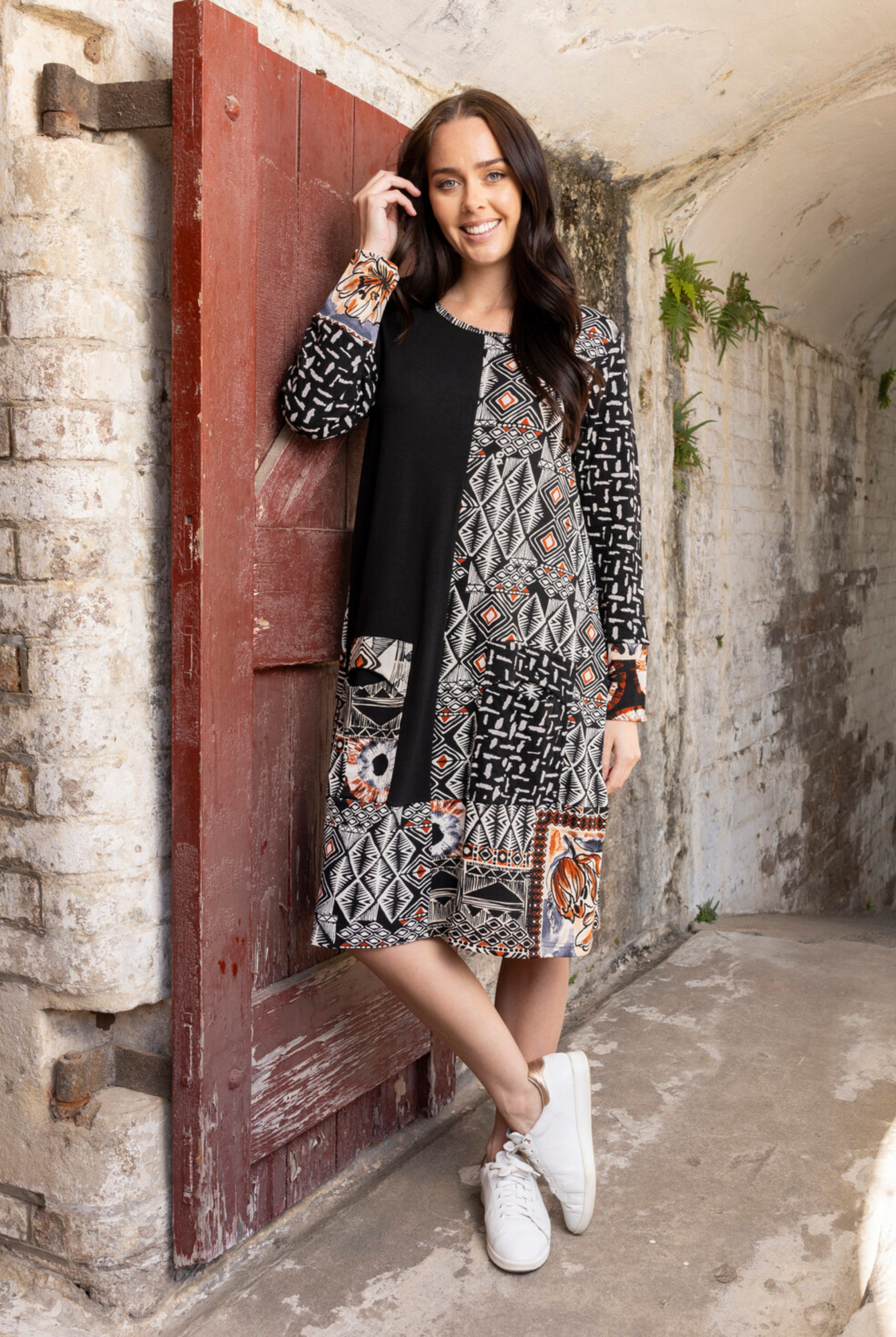 This Patch Shift Dress is the perfect blend of style and comfort. A relaxed silhouette, crew neckline, soft rayon cotton blend, fun prints, and pockets make this dress stylish, practical and comfortable.
