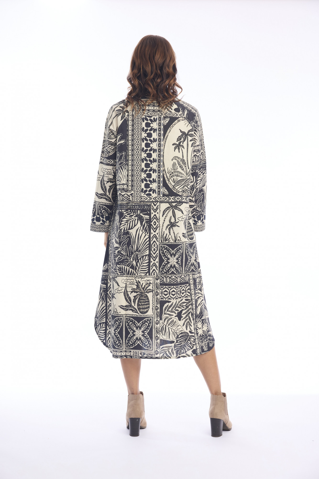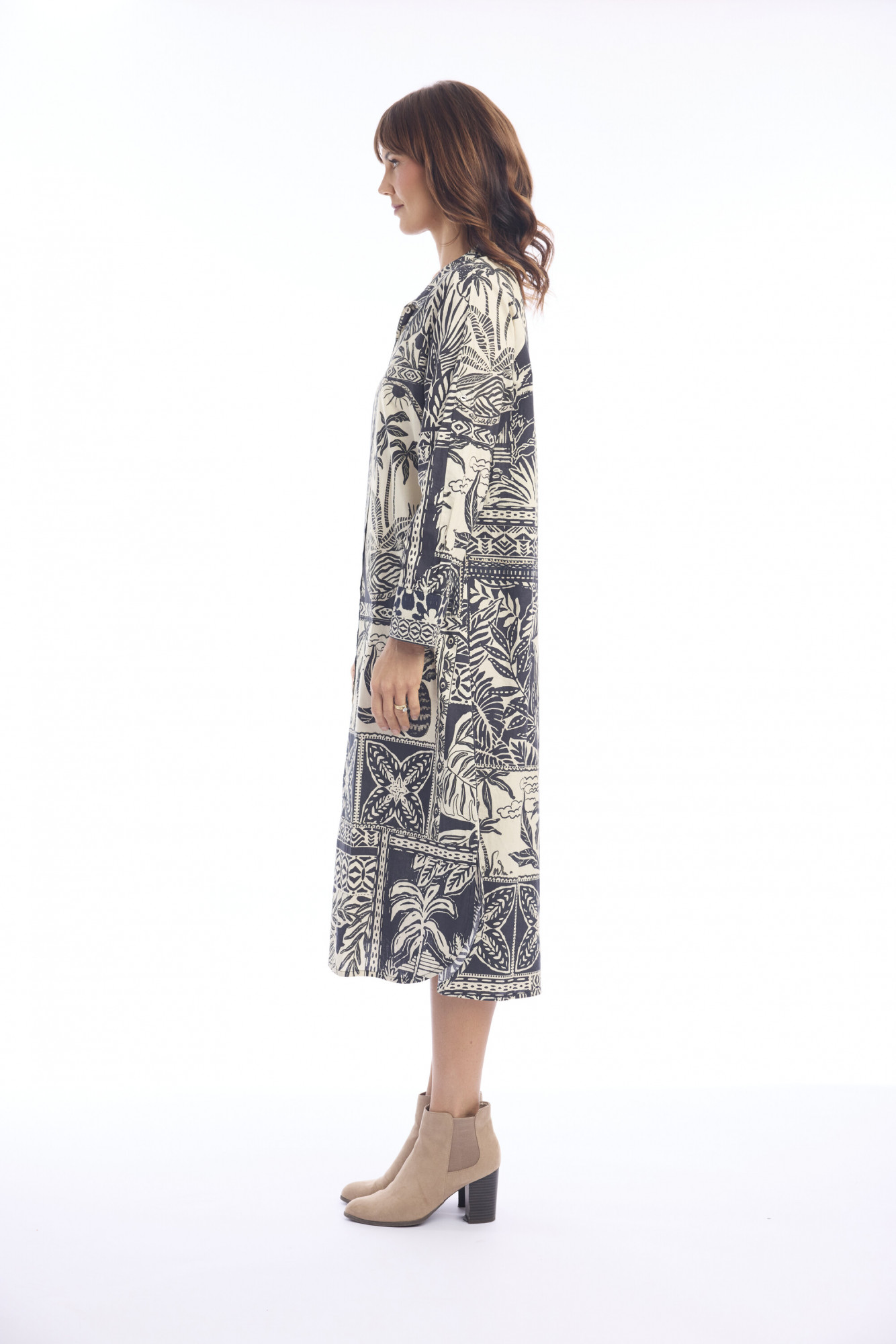 Crafted from 100% cotton, the Mallorca Dress blends relaxed elegance with statement print design. Featuring a striking black-and-white palette with tropical palms, bold leaves, and geometric patterns, it’s a piece that feels both bohemian and timeless. The tiered silhouette flows gracefully with every step, while thoughtful details like elasticated cuffs, a shirt collar, and a button-front placket add ease and versatility. Finished with a gold-trim hem, this shirtdress is perfect for resort escapes or elevated everyday wear.