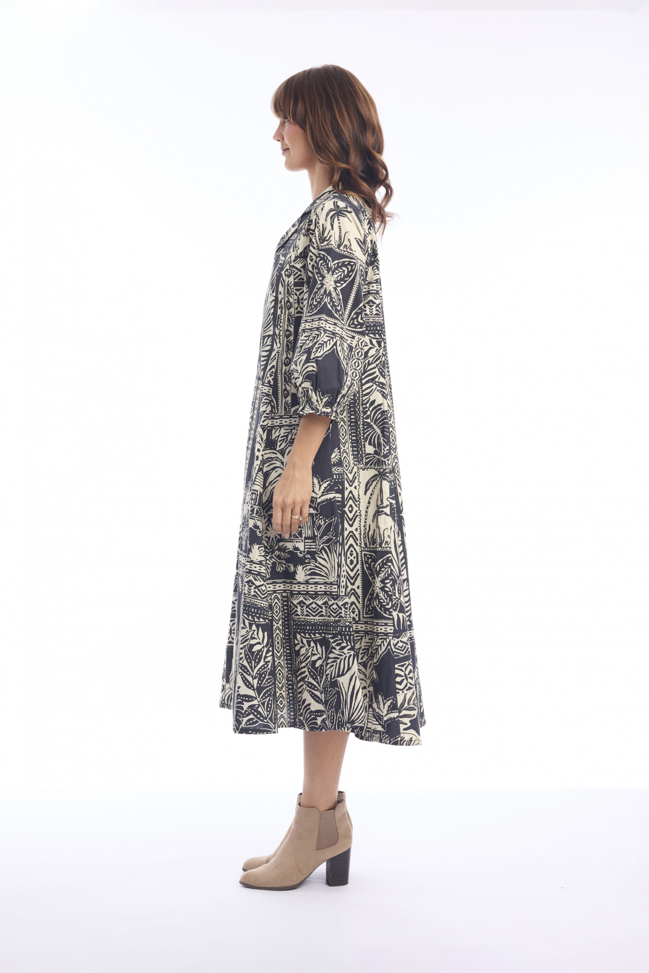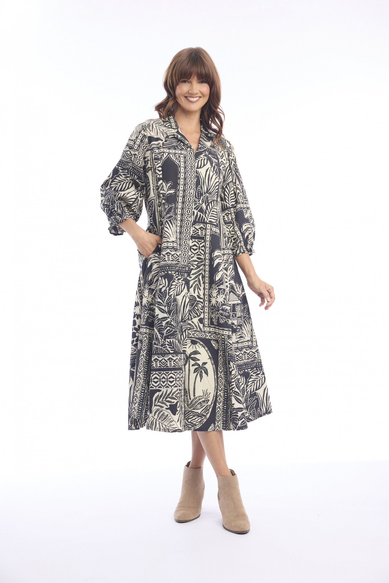 The Mallorca Dress Collar is a stylish midi dress crafted from 100% cotton for breathable comfort. Its relaxed, slightly A-line silhouette gently flares from the waist, creating an easy, flattering fit. The classic point collar and button-down front lend a timeless, shirt-inspired look, while three-quarter puffed sleeves with gathered cuffs add subtle volume and femininity. Functional side pockets offer practicality without compromising style. Featuring an intricate black and cream botanical print, this dress balances elegance with everyday wearability—perfect for workdays, brunches, or casual outings.