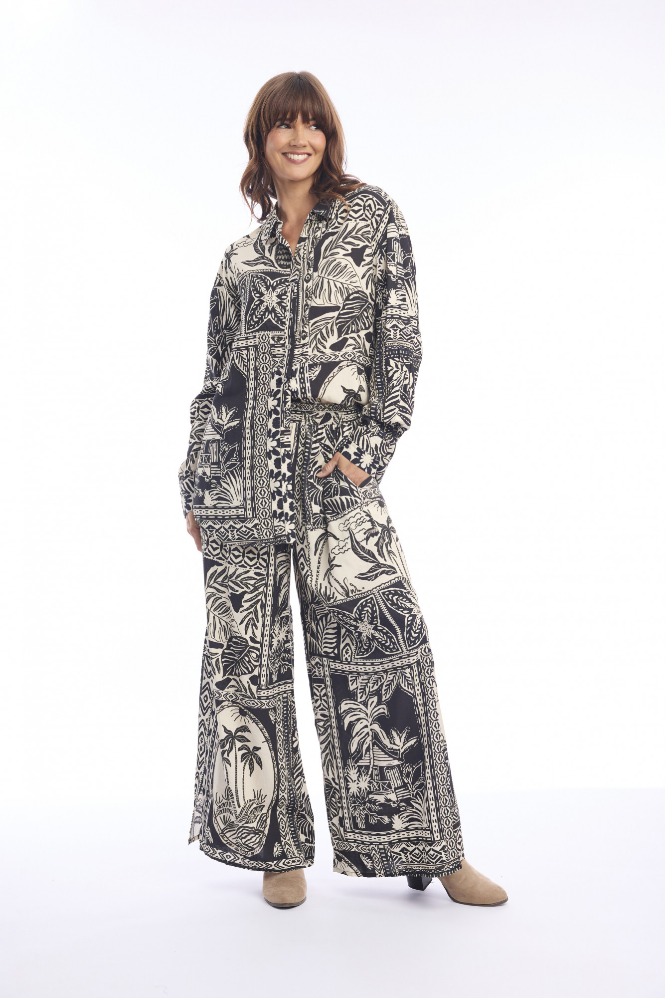 Made of 100% rayon, this shirt blends timeless comfort with modern bohemian flair. Designed with a relaxed silhouette, it features a classic button-down front, long sleeves with cuffs, and a collared neckline for effortless style. The hemline is accentuated with a decorative border that adds a touch of detail and distinction, making it versatile for both casual and elevated looks.