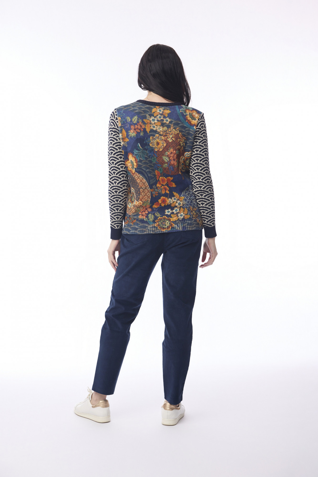 Made from 100% wool, this long-sleeved jumper features a classic V-neckline and a relaxed, comfortable fit. The fabric showcases a vibrant and intricate all-over print, with contrasting patterned details on the sleeves for a playful, stylish touch. The jumper is free of buttons or pockets, offering a clean, streamlined silhouette that pairs easily with a variety of bottoms.