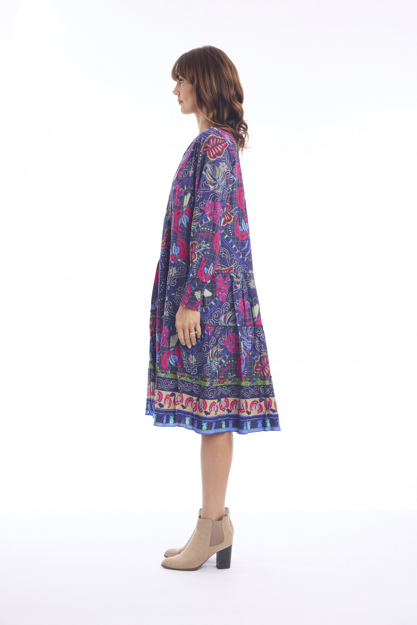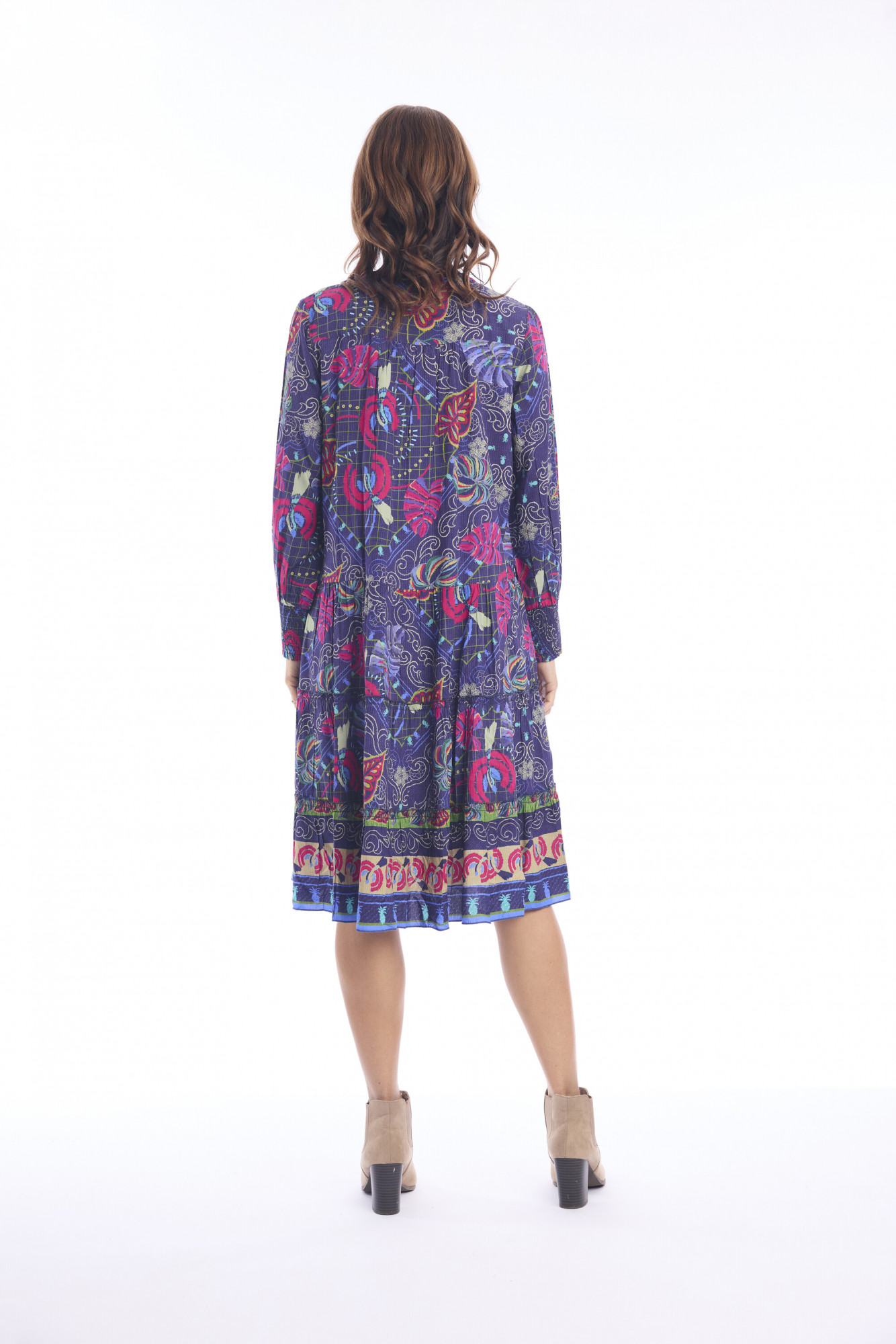 Elevate your everyday style with this effortlessly chic knee-length dress. Crafted from 100% rayon, it drapes gracefully with an A-line silhouette that flatters while keeping comfort in focus. The abstract print, set against a dark background, brings a contemporary edge with its striking mix of shapes and colors. A round neckline with a delicate keyhole detail and button closure adds a subtle touch of charm. Three-quarter sleeves taper softly at the cuffs, balancing ease and refinement. Finished with a banded hemline featuring ornate detailing and repeating circular motifs, this dress is a perfect blend of modern artistry and timeless wearability.