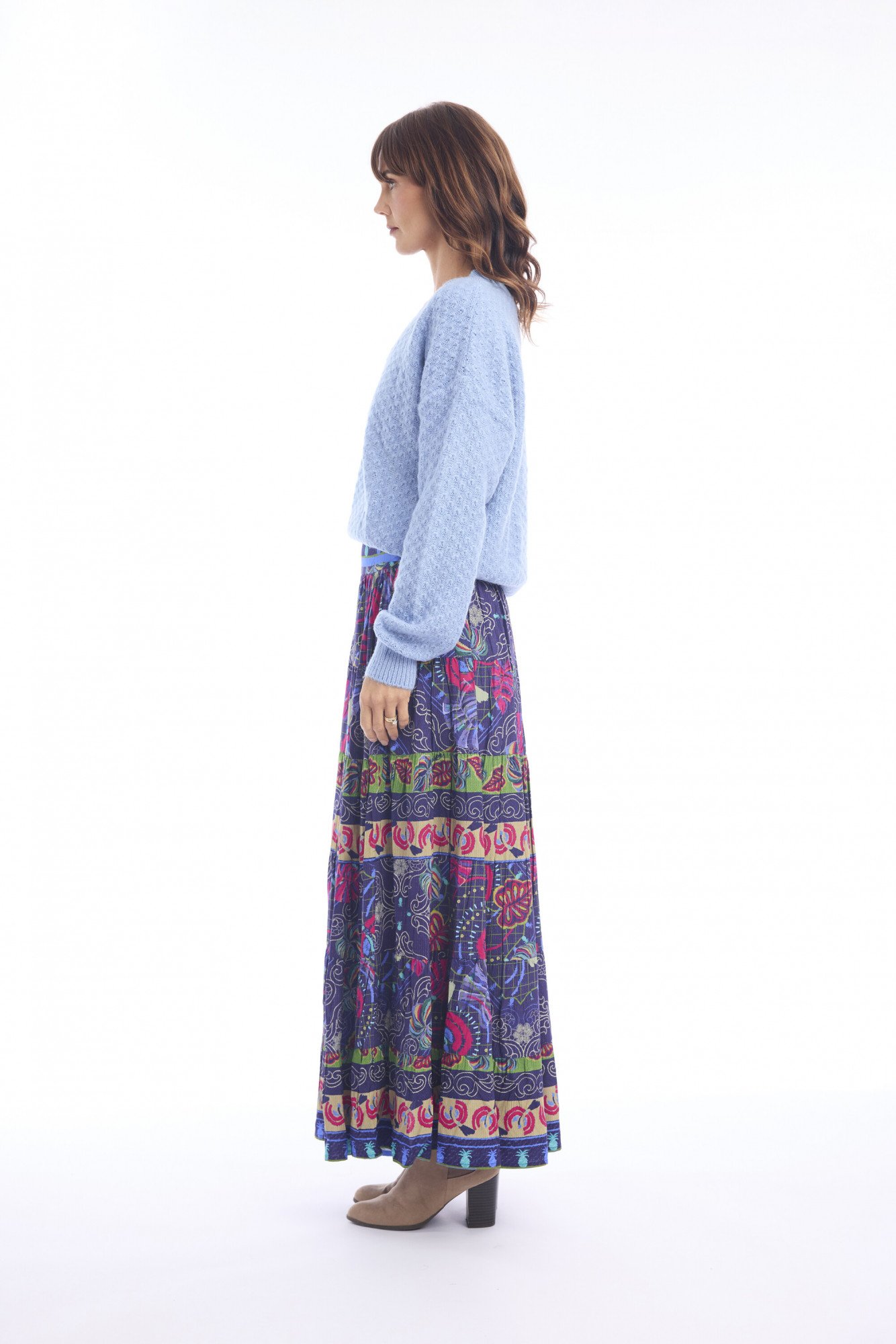 Crafted from 100% rayon, this maxi skirt combines comfort with effortless bohemian charm. The tiered construction creates graceful movement, while the vibrant print makes it a standout piece for casual and dressy occasions alike.