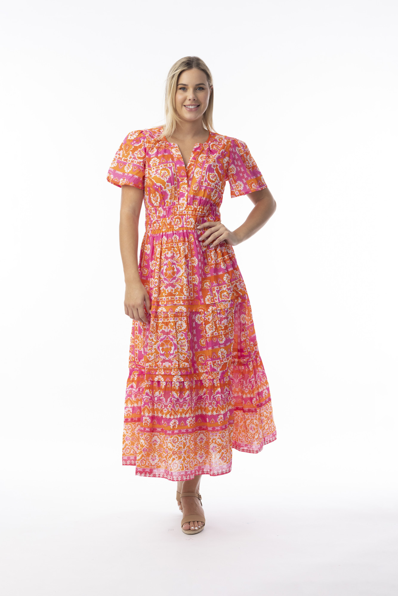 Celebrate summer in our elegant garment, the Montevideo Pink Midi Dress. Featuring a flattering v neckline and flared short sleeves, this dress combines comfort with sophistication. The ruched waist accentuates your silhouette, while the gathered tiered skirt falls elegantly over your figure. The perfect dress for brunch with the girls!