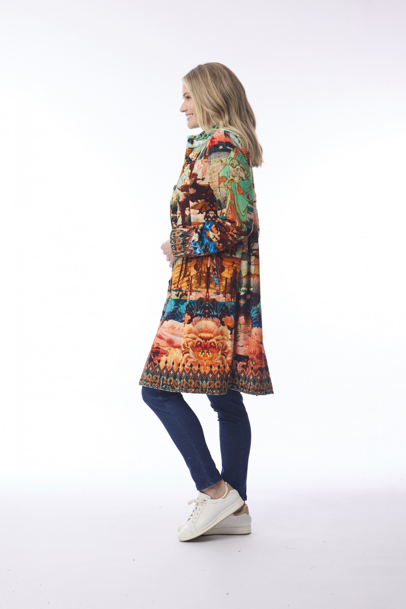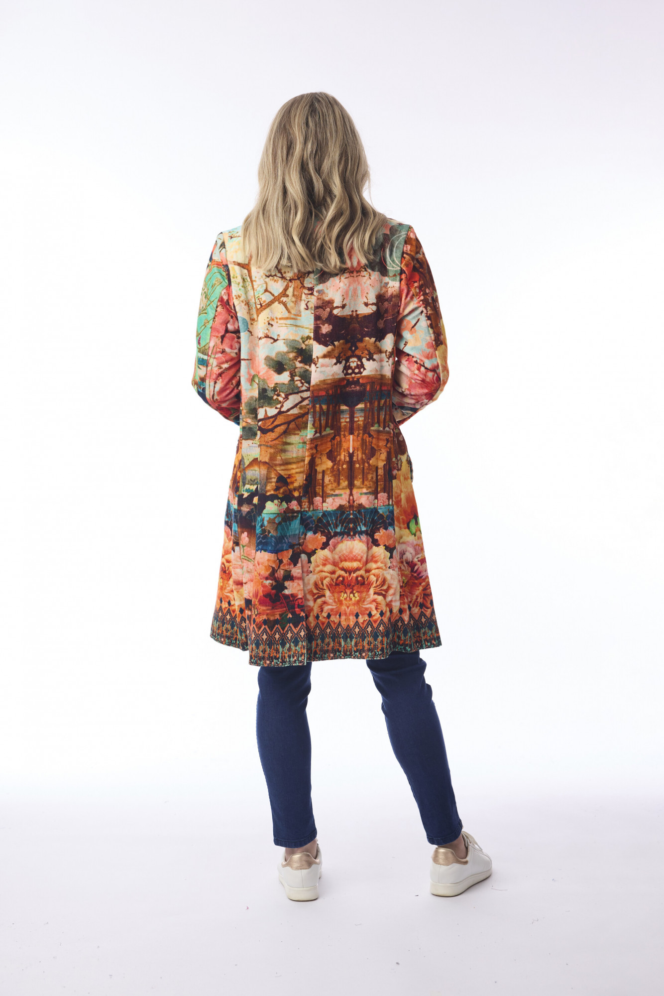 Make a statement with the Nippori Jacket, a mid-length coat featuring vibrant floral, geometric, and abstract prints in warm, eye-catching tones. Designed with a fitted waist, stand-up collar, and button-front closure, this long-sleeved jacket blends classic tailoring with bold, contemporary style.