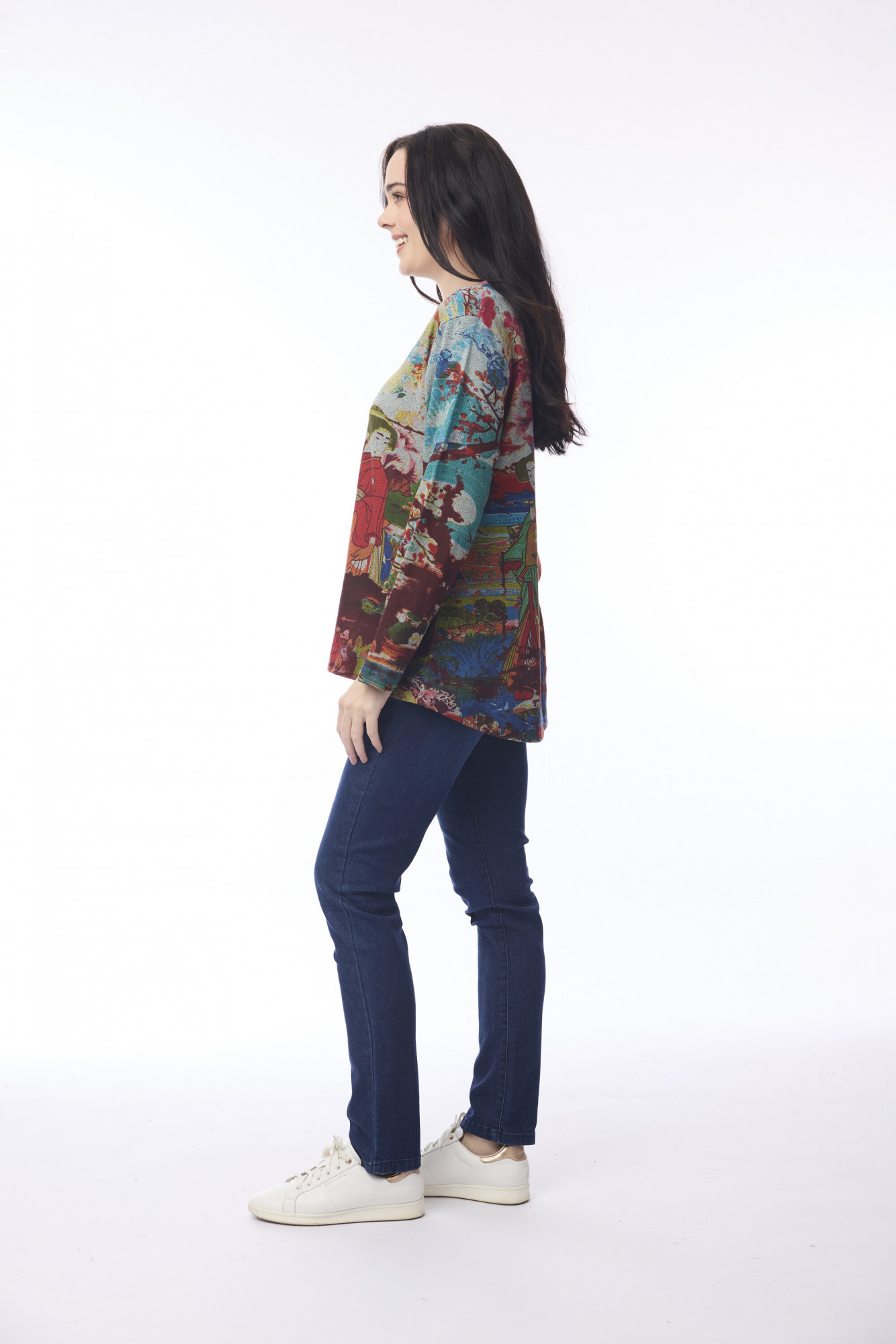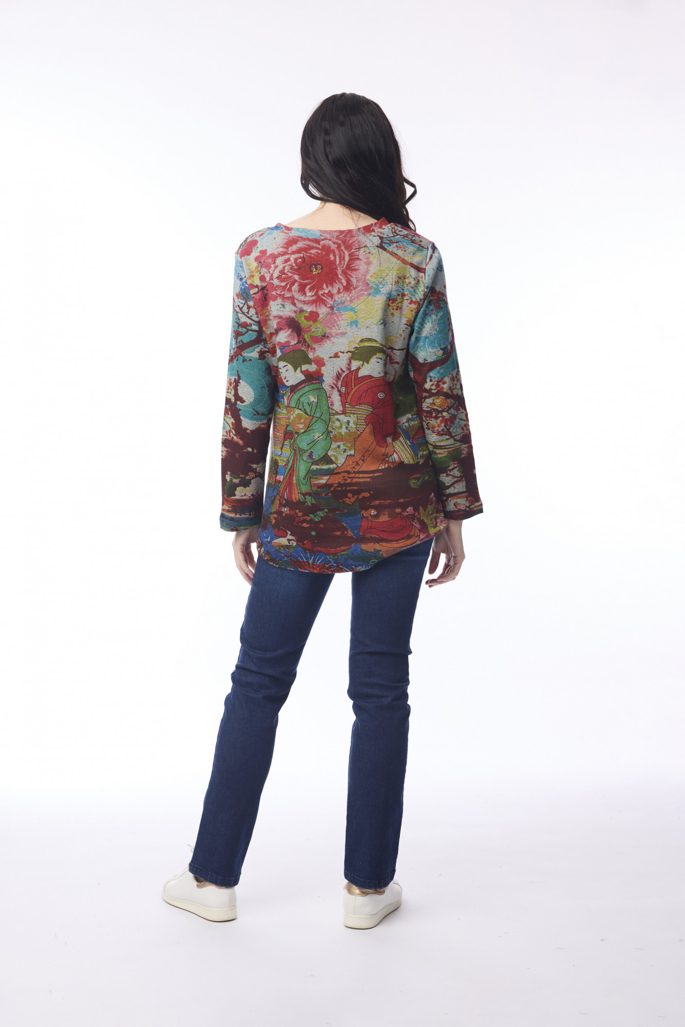 Bring artistic flair to everyday wear with the Nippori T-shirt. Made from 100% soft cotton, this relaxed, long-sleeved top features a flowing, boxy silhouette that drapes comfortably over the hips. Its standout feature is the vibrant, intricate print inspired by traditional Japanese motifs, depicting figures in kimono against a serene natural backdrop. The simple V-neckline and clean-finished cuffs balance the bold design, making this top a statement piece that pairs beautifully with jeans or leggings for effortless style.