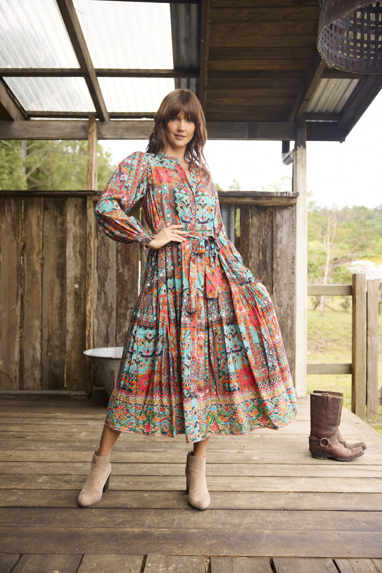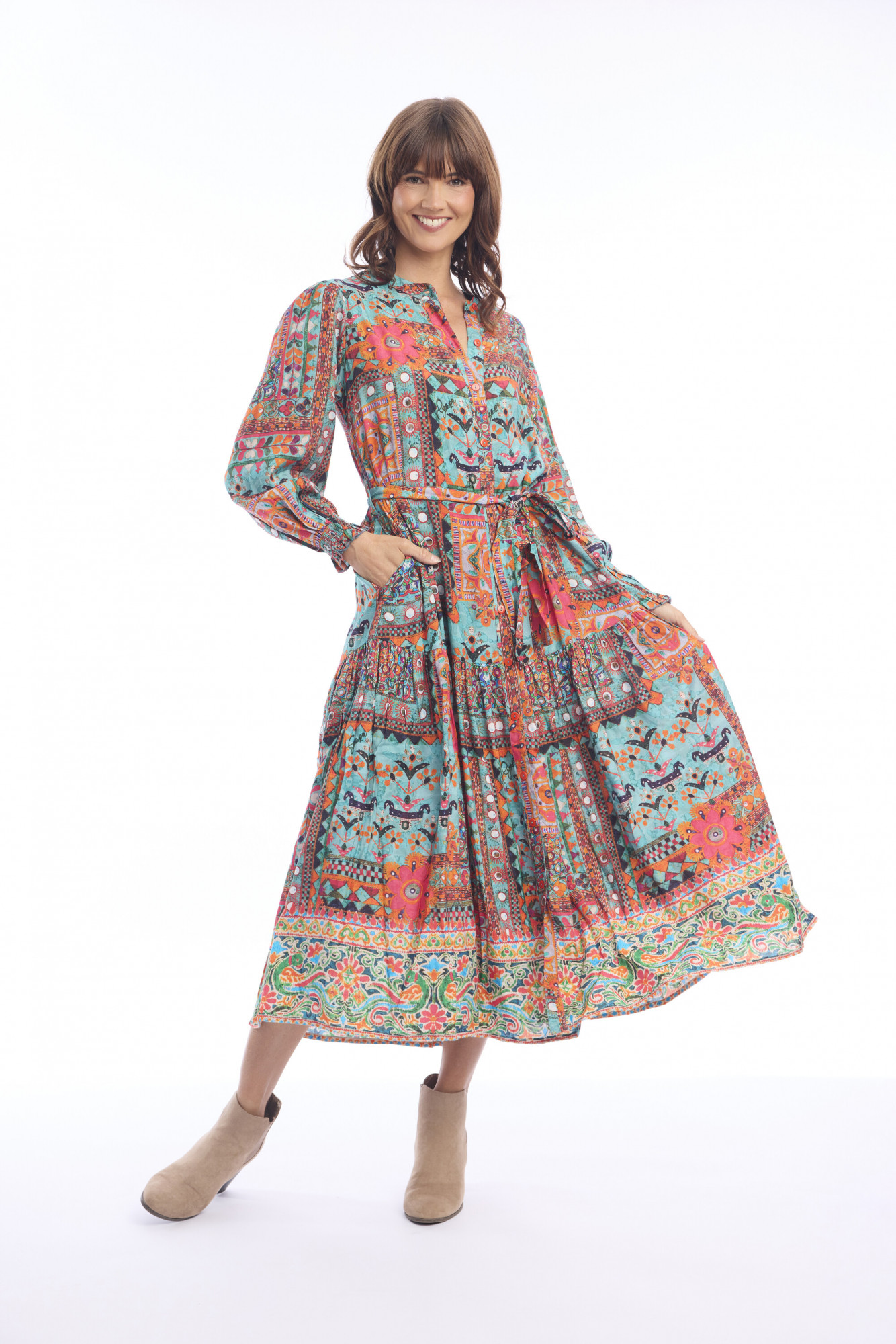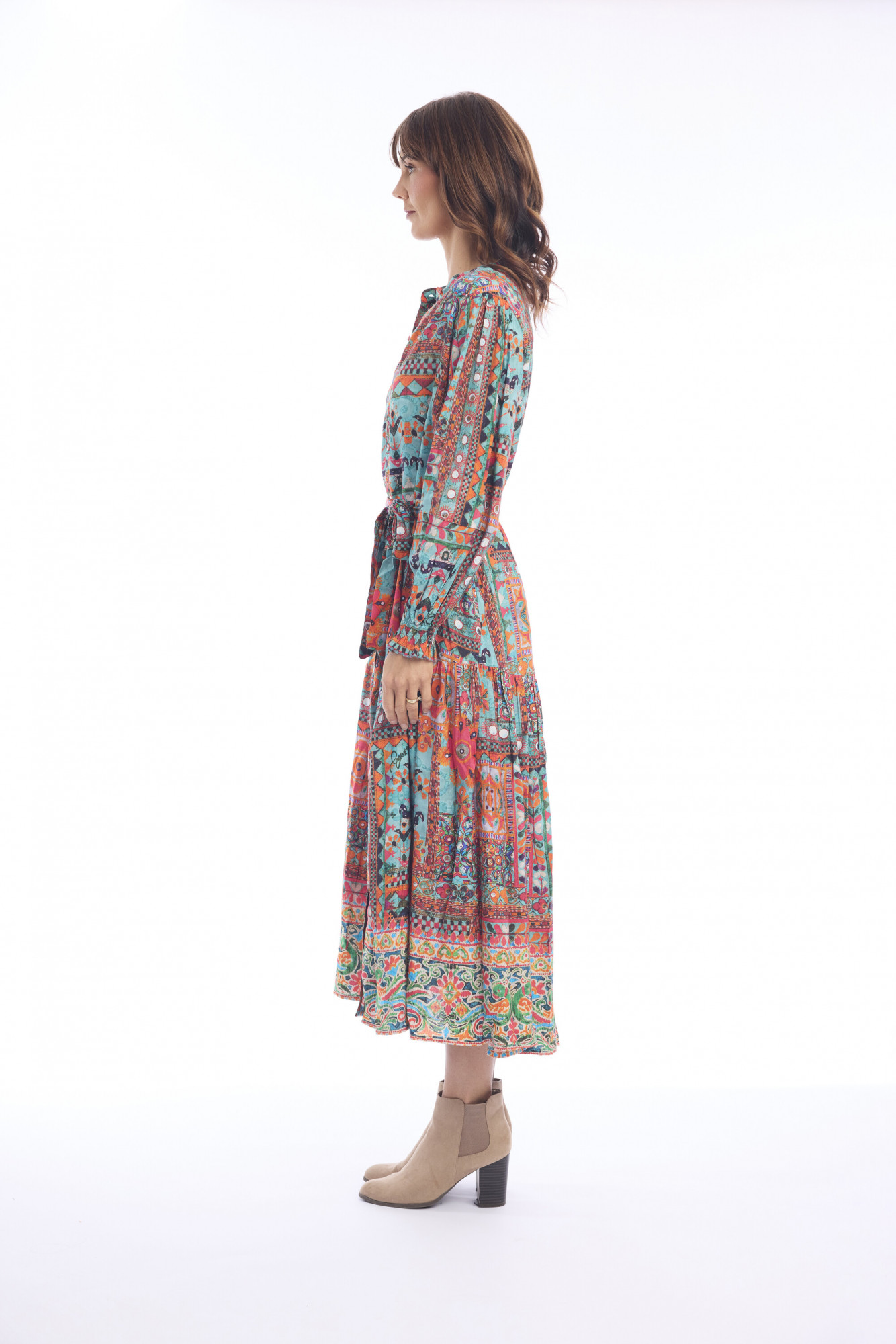 This bohemian-inspired midi dress is crafted from 100% rayon, offering a lightweight and breathable feel. Designed with a round neckline and long sleeves, it balances comfort with elegance. A matching fabric belt defines the waist, while the slightly A-line silhouette ensures a relaxed, flattering fit. The tiered hem adds movement and charm, making it an easy choice for both everyday wear and special outings.