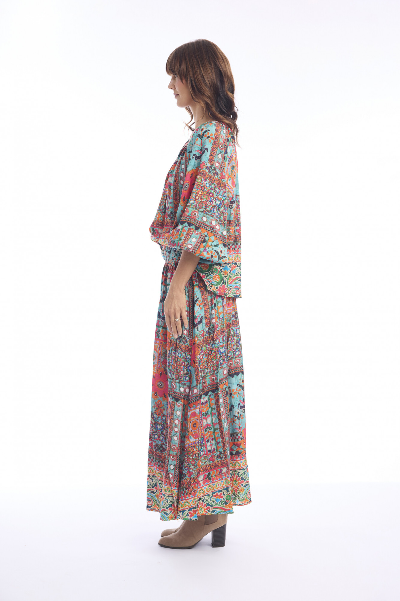 Bring relaxed bohemian style to your wardrobe with the Rabari Top Boho, crafted from 100% soft rayon. This waist-length top features a loose, slightly gathered silhouette and long, wide bell sleeves for a flowing, airy feel. The rounded square neckline adds a subtle, elegant touch, making it a versatile piece for pairing with skirts, pants, or layering under dresses.