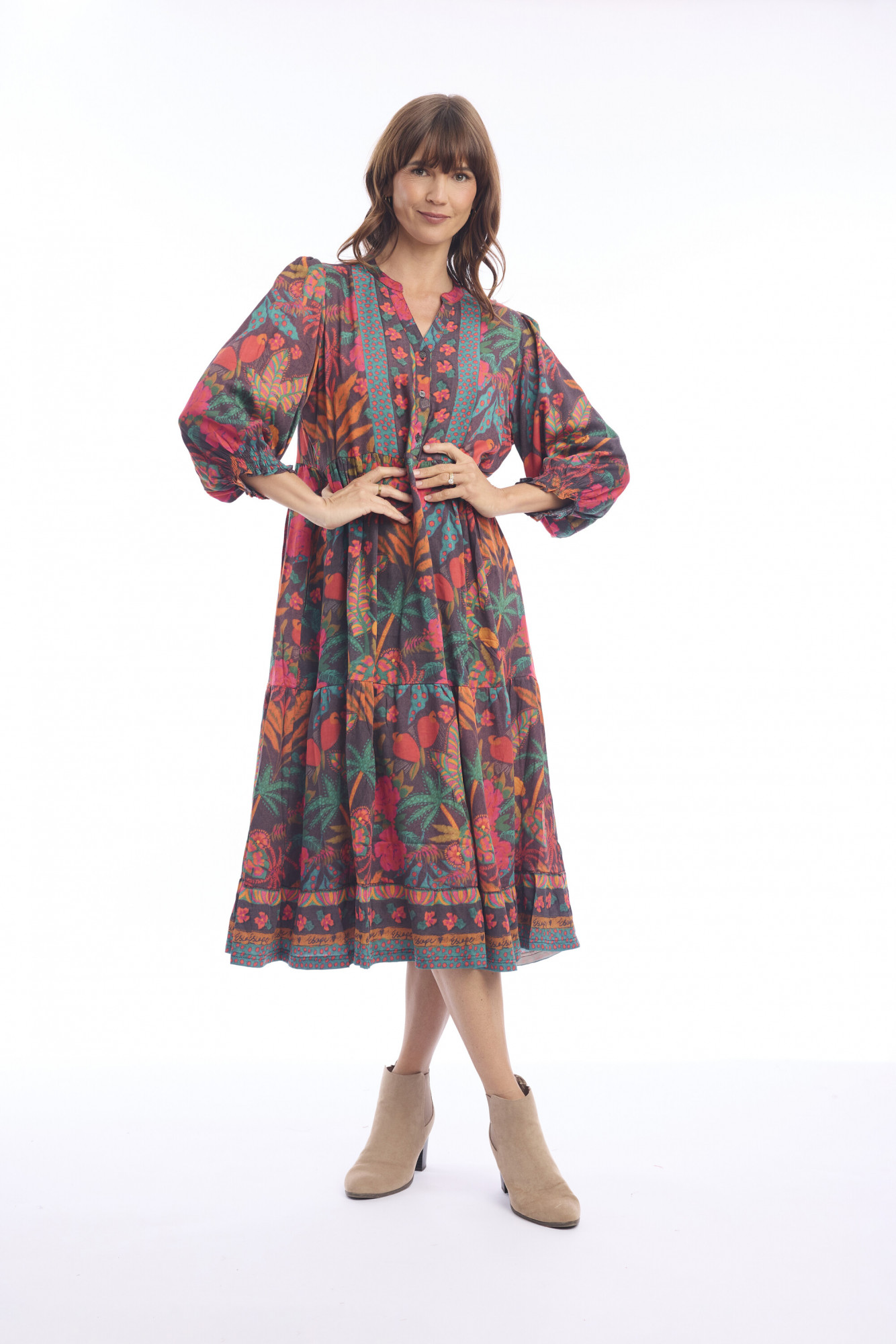 Elevate your wardrobe with this effortlessly elegant midi dress, crafted from 100% rayon for a luxuriously soft and breathable feel. Designed with a fluid layered silhouette, it drapes beautifully to create graceful movement with every step. The midi length strikes the perfect balance between sophistication and ease, making it ideal for both daytime wear and evening occasions. Lightweight and versatile, this dress can be styled solo in warm weather or layered for cooler months. A timeless piece that blends comfort with refined charm, it’s destined to become a go-to favorite for any occasion.