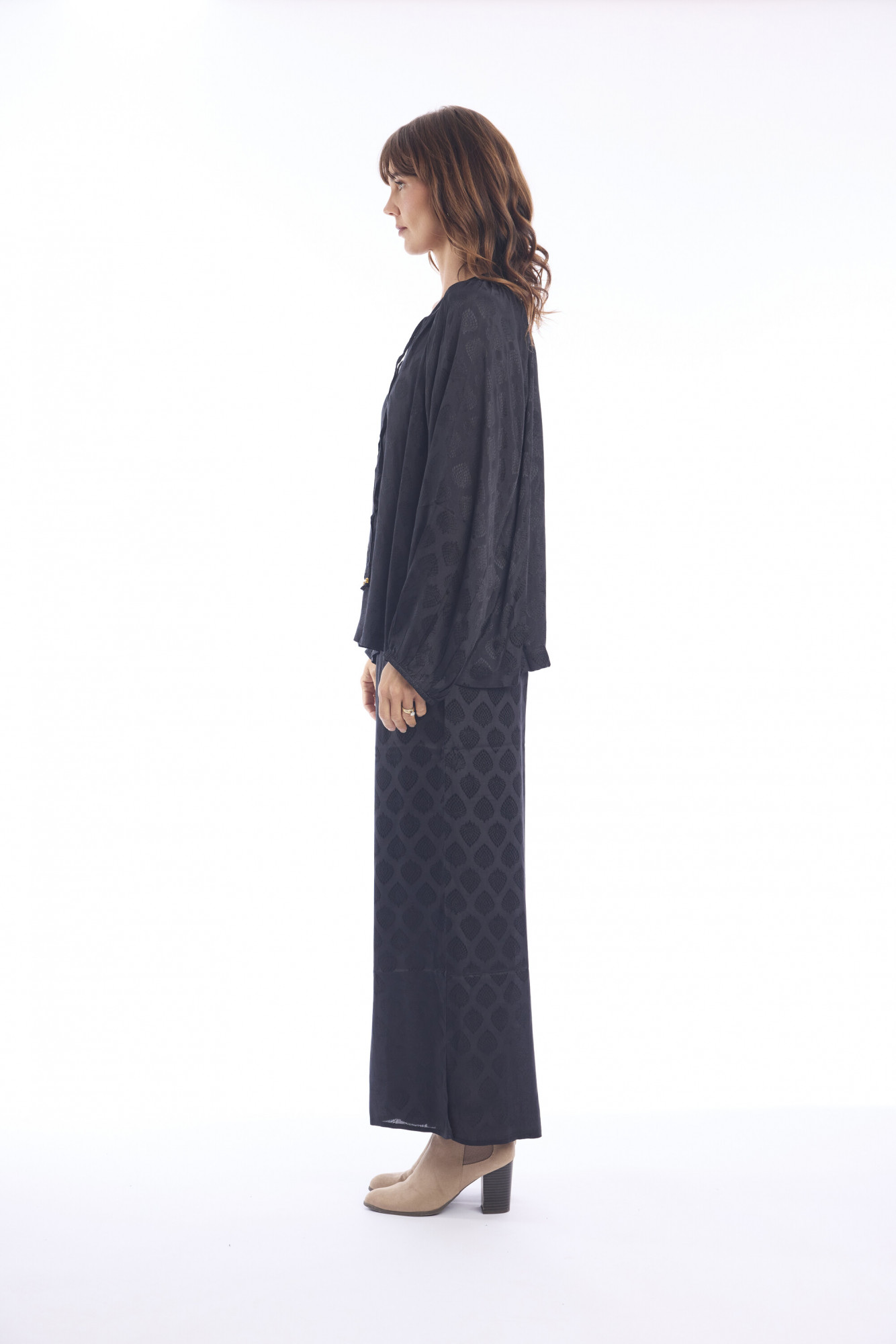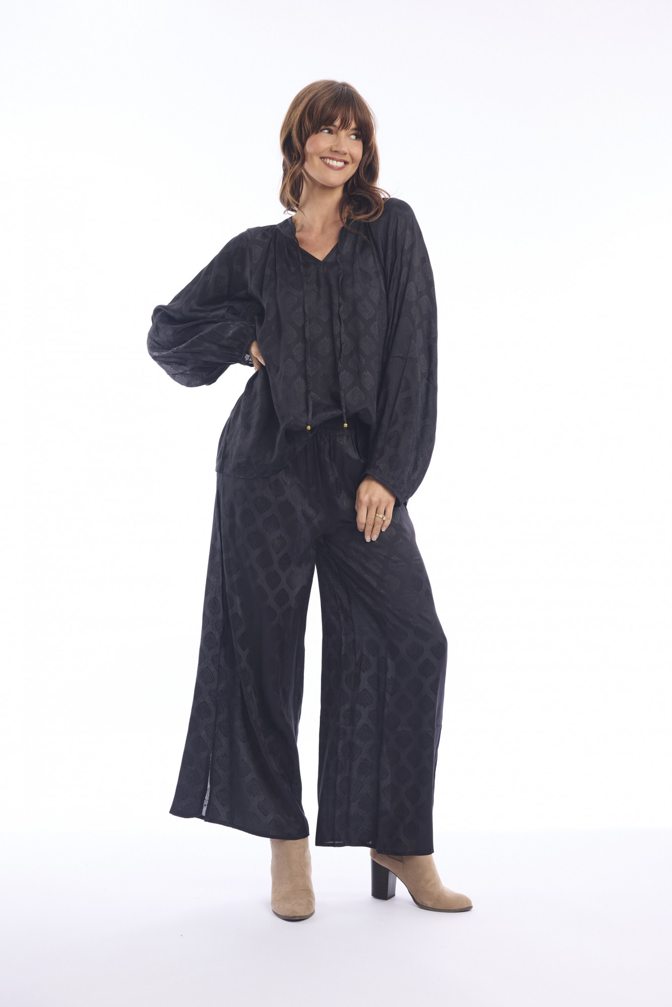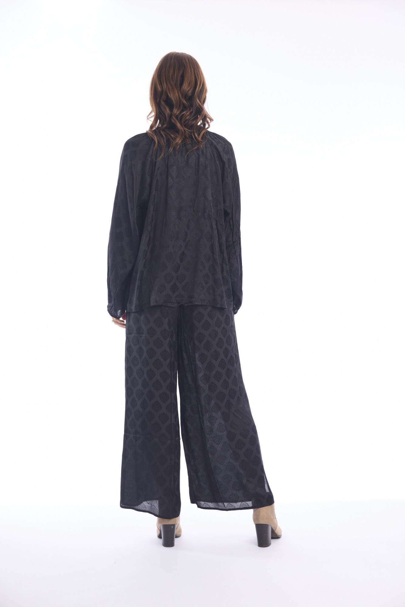 Crafted from 100% rayon, these full-length palazzo pants bring effortless style and comfort to everyday dressing. Designed with a wide-leg cut and a flowing silhouette, they drape beautifully for a relaxed yet elevated look. The fabric has a subtle, jacquard-inspired texture that adds depth and sophistication. Available in a range of colors, these versatile pants pair seamlessly with both casual tops and dressier styles, making them a wardrobe staple.