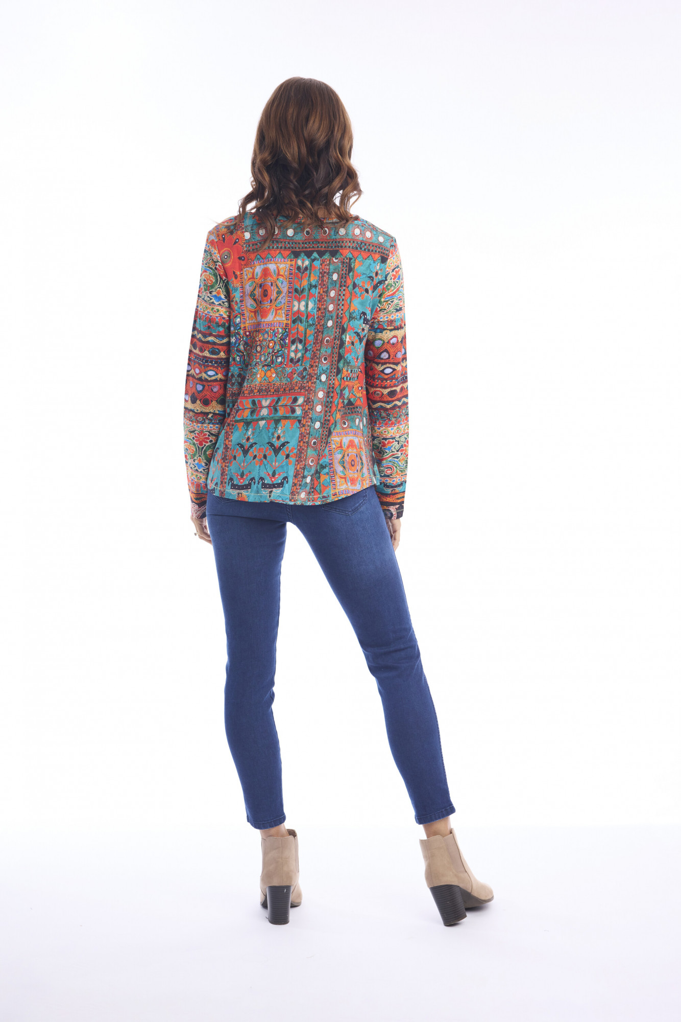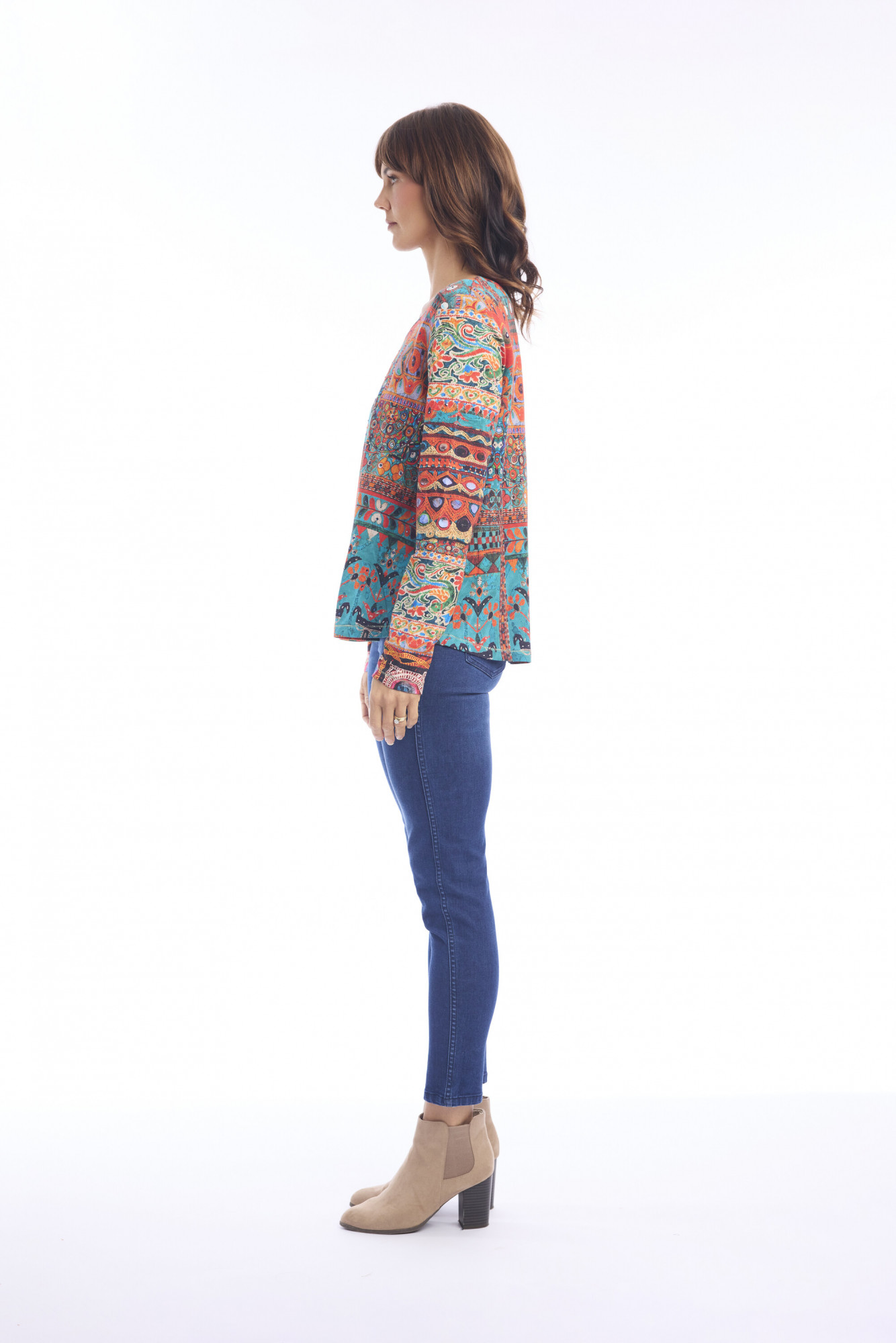 Bring effortless style to your everyday look with this long-sleeved top, crafted from a soft cotton blend for all-day comfort. Designed with a flattering silhouette that gently skims the waist before falling to the hips, it offers both ease and shape. The standout feature is its artistic print, combining a mix of colors and patterns that add a vibrant, eye-catching touch. Perfect for pairing with jeans, skirts, or tailored pants, this versatile top transitions seamlessly from casual outings to more polished occasions.