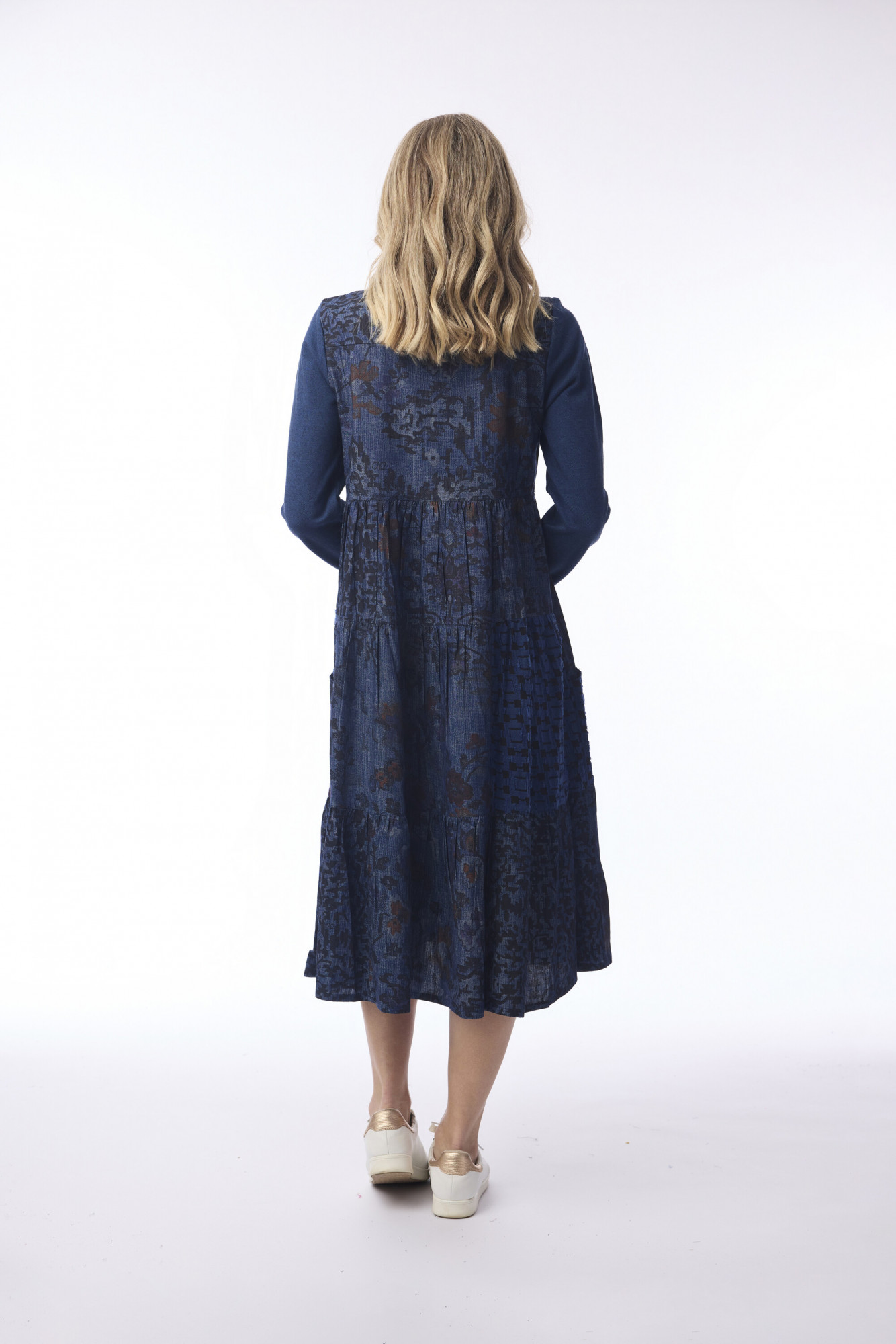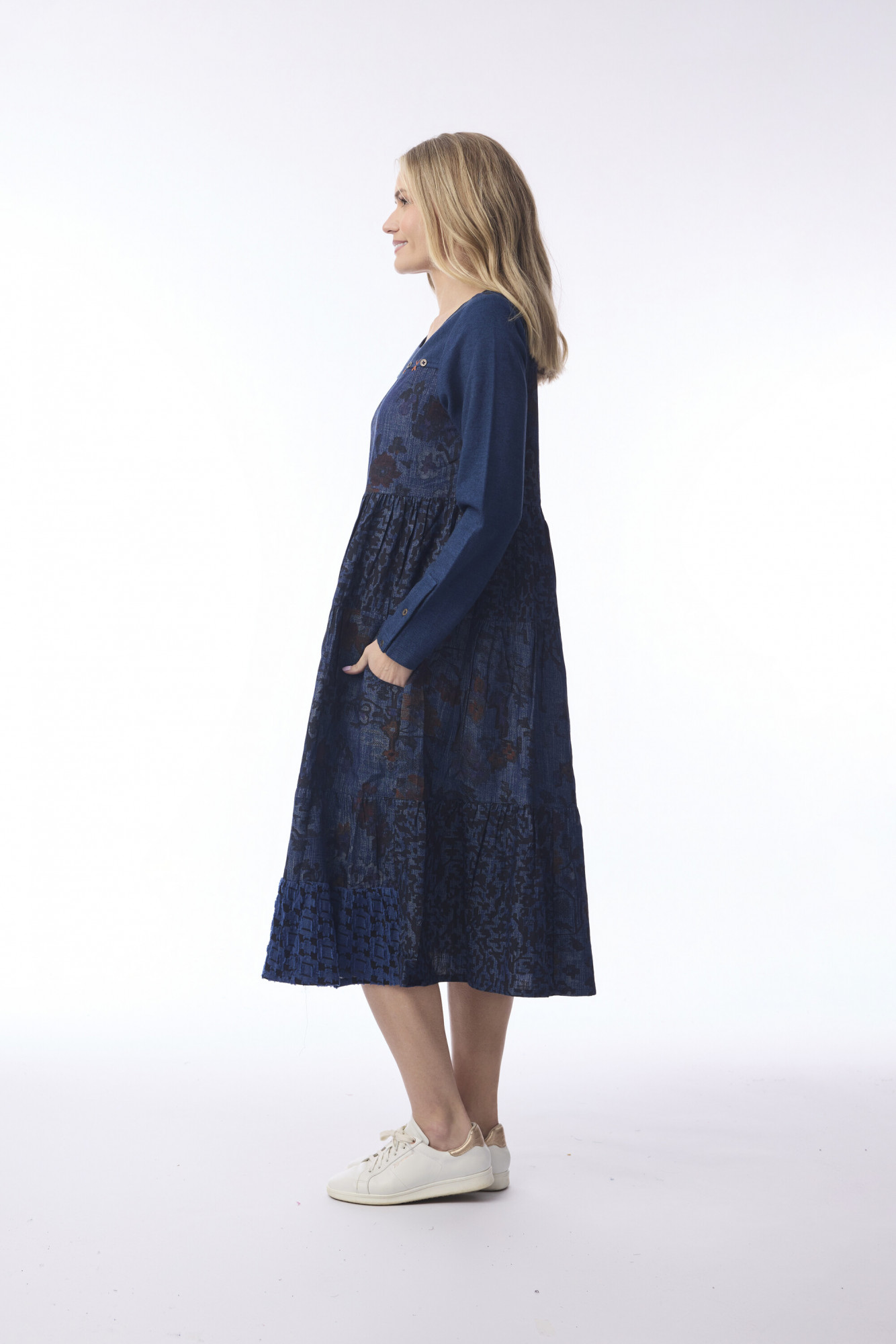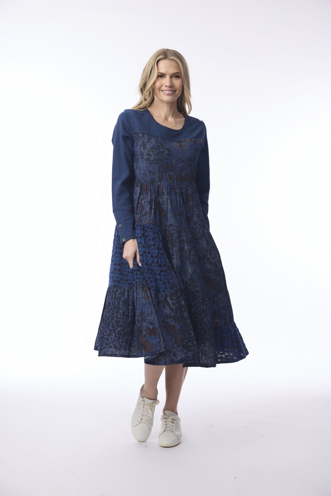 The Tabriz Dress is a beautifully crafted piece that blends comfort with artisanal charm. Made from 100% cotton, it features a solid-toned bodice with a rounded scoop neckline, accented by a patterned yoke and rustic stitch detailing for a touch of individuality. The long sleeves are finished with buttoned cuffs, balancing structure with ease. Falling just below the knee, the tiered skirt brings volume and flow, enhanced with intricate all-over patterns and a subtle patchwork accent that adds texture and depth. Effortlessly combining casual comfort with bohemian flair, the Tabriz Dress is perfect for everyday wear or relaxed occasions.