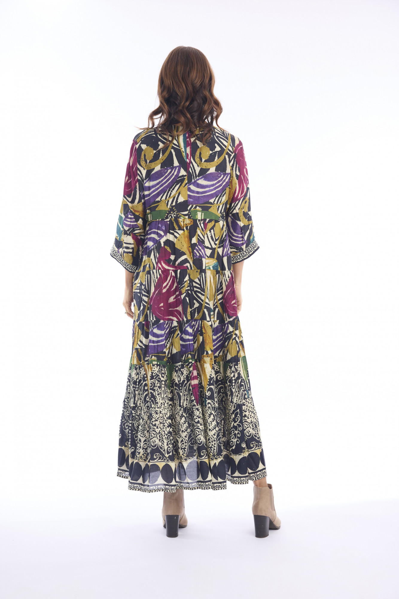 Effortlessly elegant, this maxi-length dress is crafted from 100% rayon for a soft, breathable feel. The relaxed A-line silhouette flows into tiered layers, creating graceful movement and a flattering drape. A V-neckline is accented with decorative embroidered trim and subtle bead or sequin embellishments, while the three-quarter sleeves feature gentle puffing at the shoulders and contrasting cuffs for added charm. Functional side patch pockets complete the look with practicality. Designed to transition seamlessly from casual outings to relaxed evenings, this dress combines comfort and style with ease.