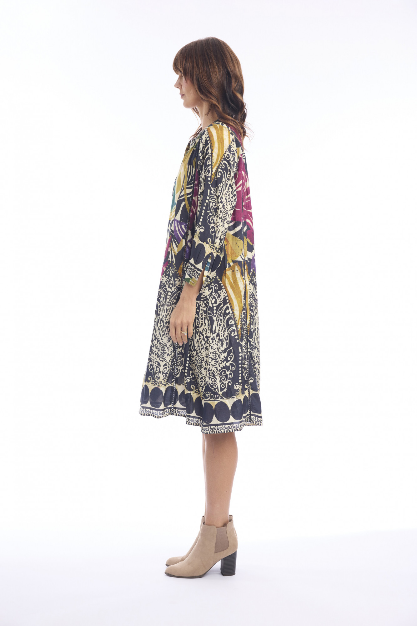 Elevate your everyday style with this effortlessly chic knee-length dress. Crafted from 100% rayon, it drapes gracefully with an A-line silhouette that flatters while keeping comfort in focus. The abstract print, set against a dark background, brings a contemporary edge with its striking mix of shapes and colors. A round neckline with a delicate keyhole detail and button closure adds a subtle touch of charm. Three-quarter sleeves taper softly at the cuffs, balancing ease and refinement. Finished with a banded hemline featuring ornate detailing and repeating circular motifs, this dress is a perfect blend of modern artistry and timeless wearability.
