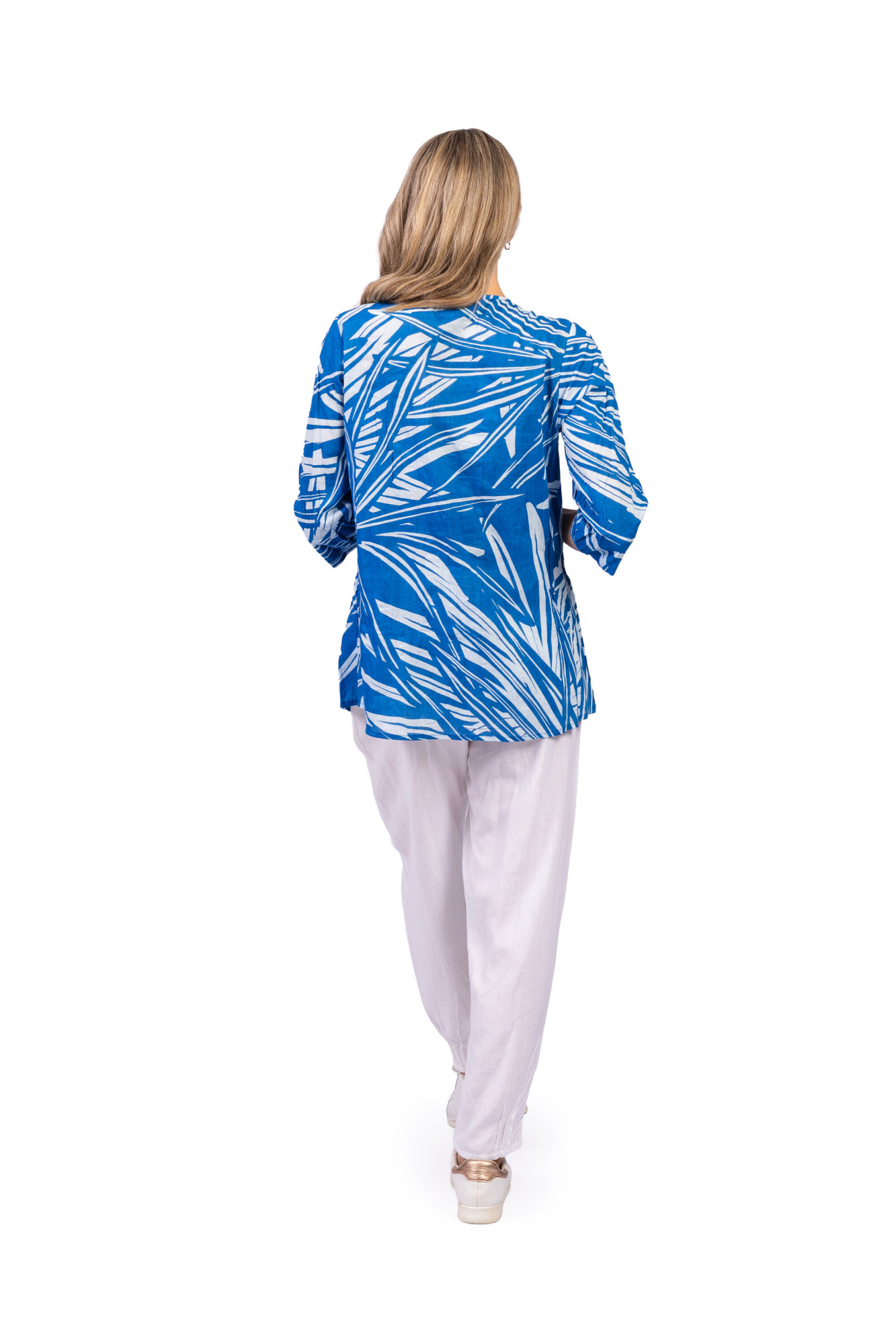 Our Tina V-neck Pleated Top offers vibrant style and 100% cotton comfort. This top features a flattering V-neck, chic 3/4 sleeves, and subtle front pleating for a graceful flow. Adorned with a lively all-over print, it's perfect for effortless, casual wear