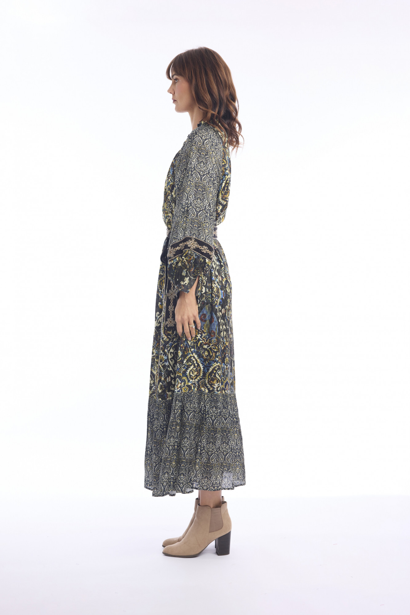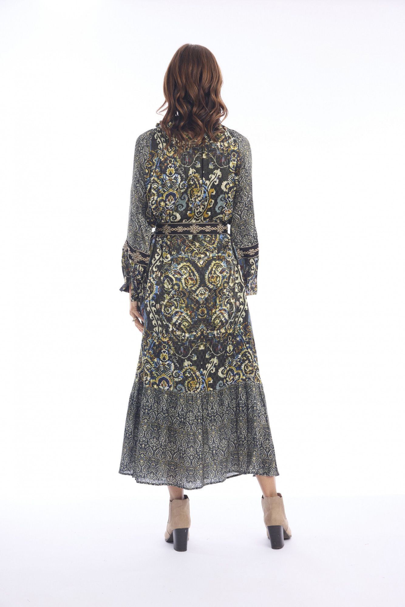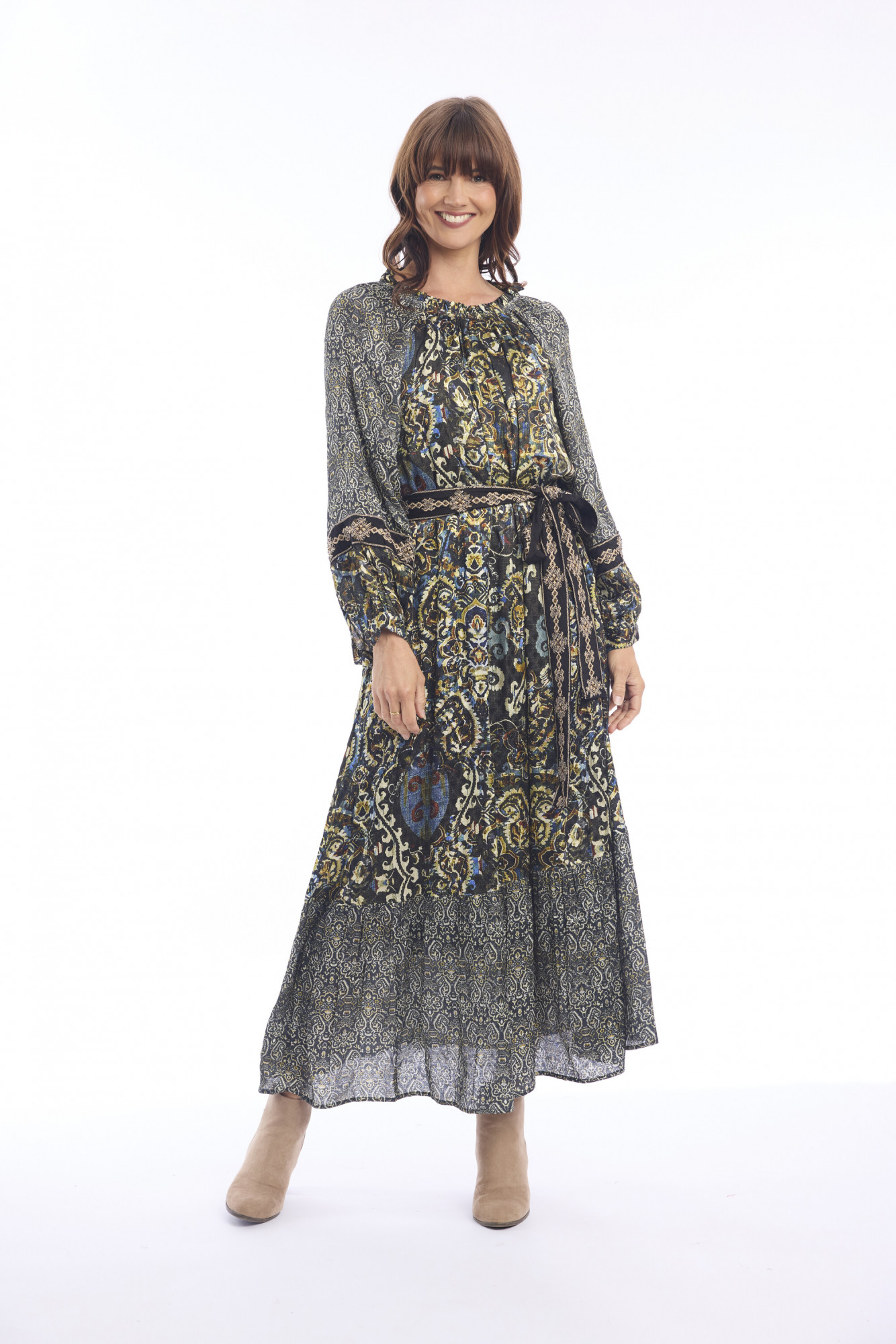 This bohemian-inspired midi dress is crafted from 100% rayon, offering a lightweight and breathable feel. Designed with a round neckline and long sleeves, it balances comfort with elegance. A matching fabric belt defines the waist, while the slightly A-line silhouette ensures a relaxed, flattering fit. The tiered hem adds movement and charm, making it an easy choice for both everyday wear and special outings.