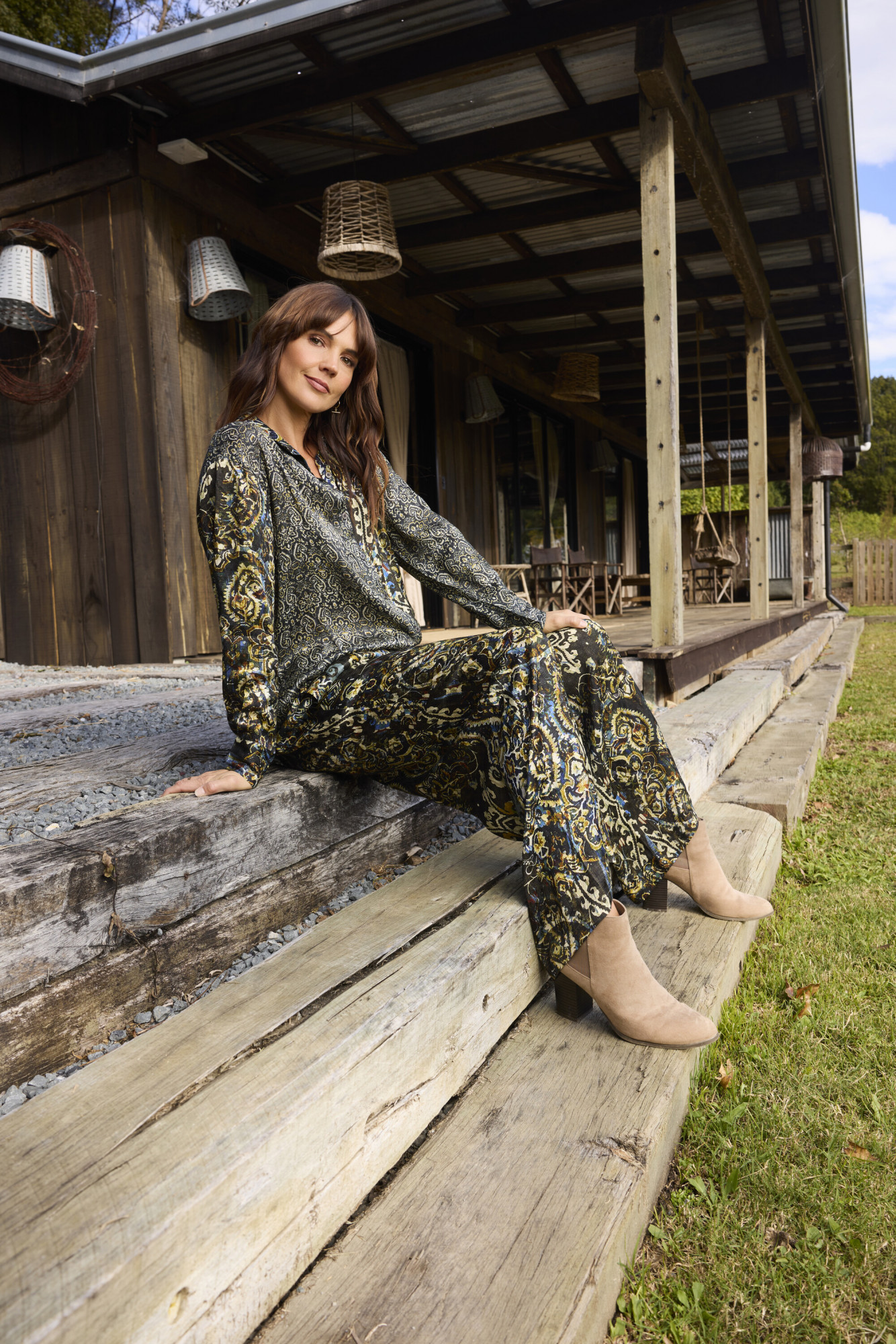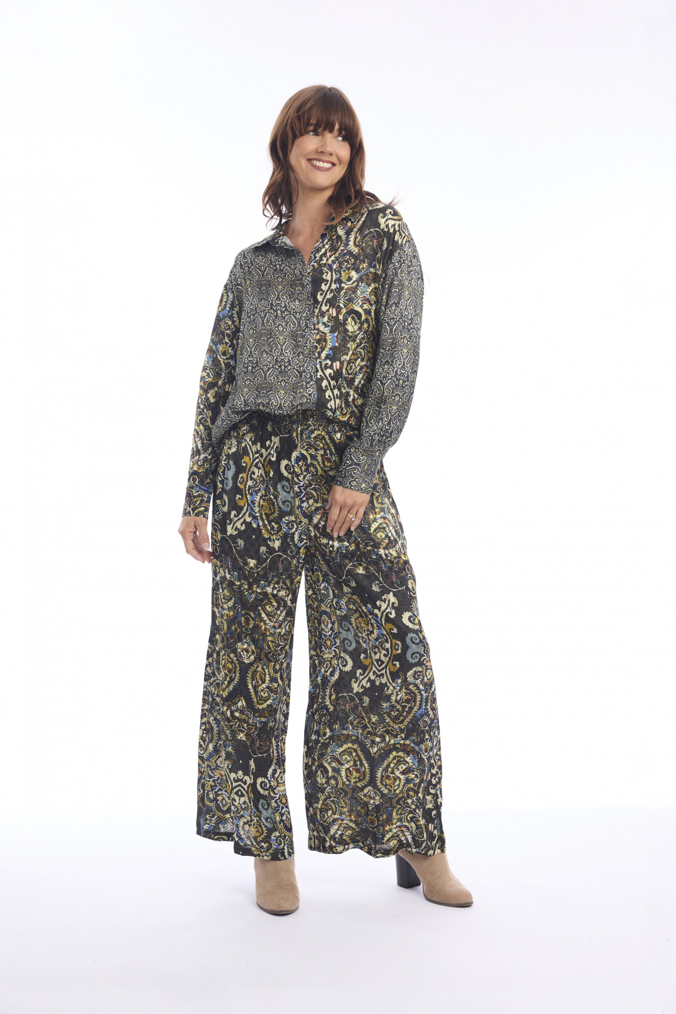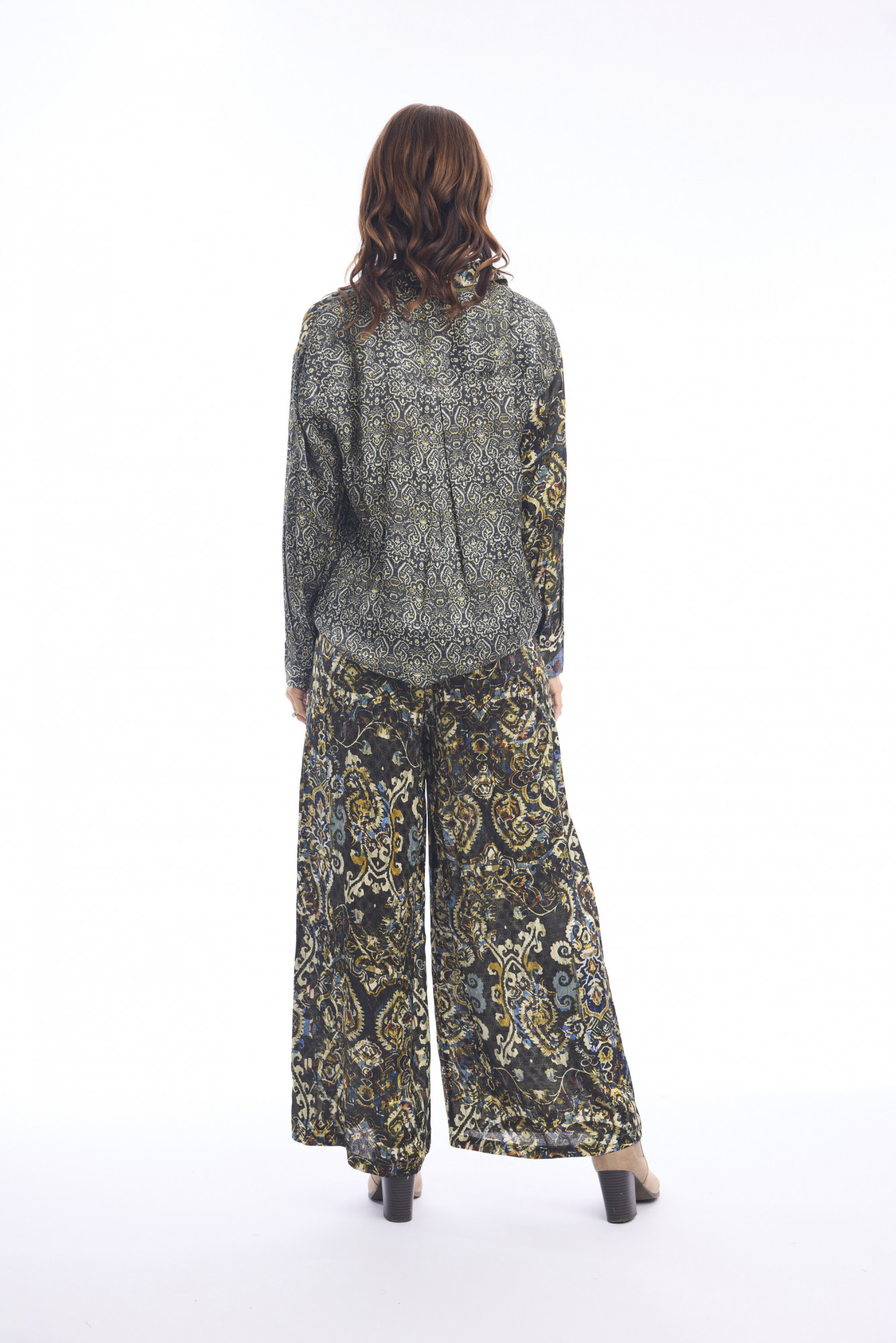 Made of 100% rayon, this shirt blends timeless comfort with modern bohemian flair. Designed with a relaxed silhouette, it features a classic button-down front, long sleeves with cuffs, and a collared neckline for effortless style. The hemline is accentuated with a decorative border that adds a touch of detail and distinction, making it versatile for both casual and elevated looks.