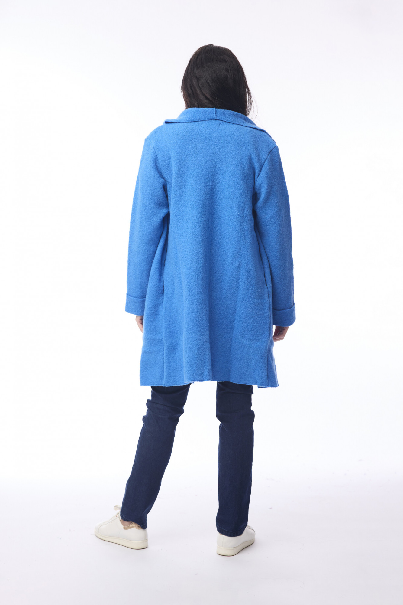 This open-front cardigan coat is crafted from 100% wool, offering natural warmth and comfort with a soft, subtly textured finish. Designed with a wide shawl collar that drapes effortlessly, it falls to a mid-calf length in a relaxed, straight silhouette. Long sleeves with turned-up cuffs add understated detail, making this coat an easy layering piece for both casual and cozy looks.